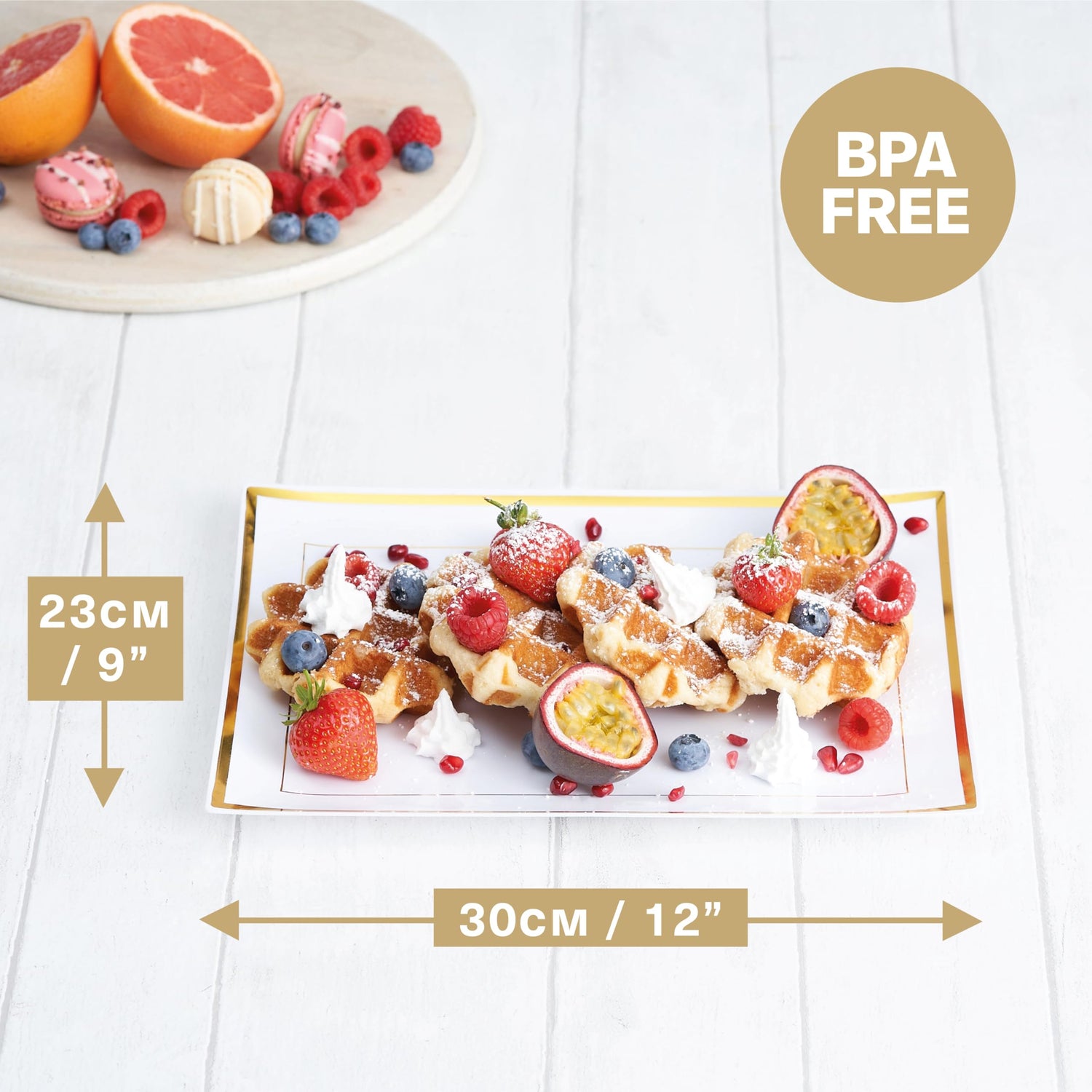 MATANA 6 Weiße Plastik Servierplatten mit Goldrand für Vorspeisen & Fingerfood - Catering, Buffets, Geburtstage, Hochzeiten & Partys - 30x 22 cm