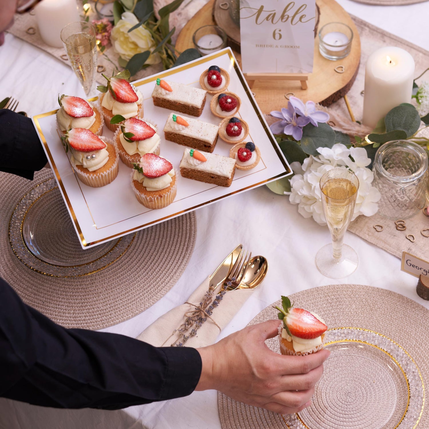 • LEICHT ZU REINIGEN: Obwohl sie einen eleganten Goldrand bieten, können Sie diese Platten einfach von Hand reinigen, um ihren Charme zu erhalten und sicherzustellen, dass sie eine beeindruckende Ergänzung zu Ihrer Tischdekoration bleiben.
