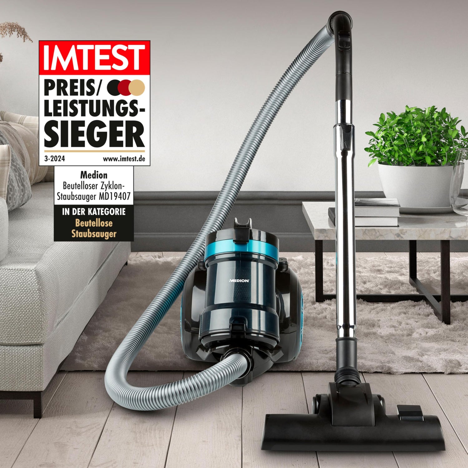 • Lieferumfang: Beutelloser Staubsauger MD 19407, Universalbodendüse, Fugen-/Bürstenaufsatz, Teleskopsaugrohr.
