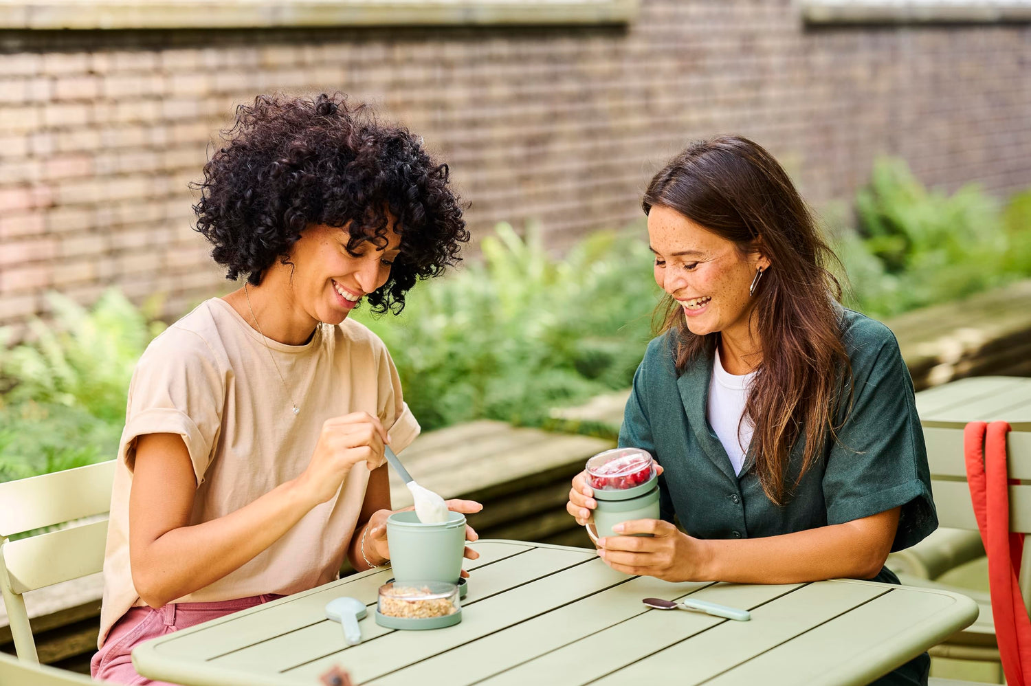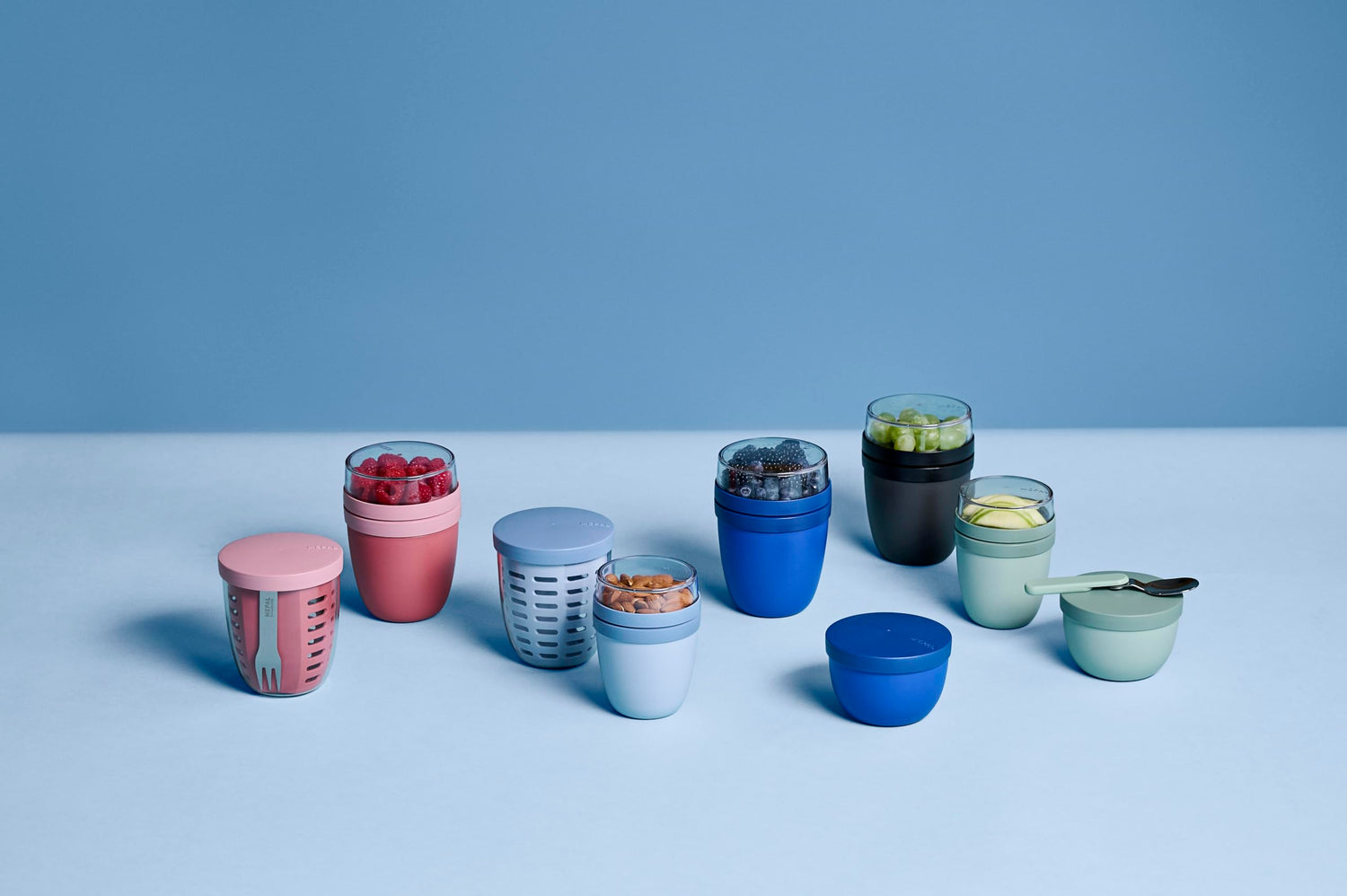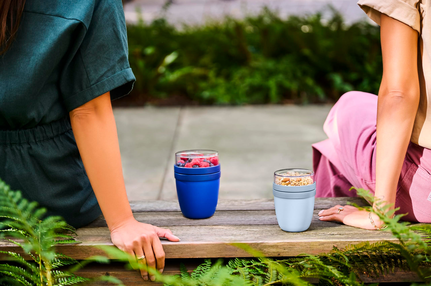Der Lunchtopf Ellipse von Mepal ist ein praktisches Produkt zum Transportieren von Mittagessen oder Snacks. Der Joghurtbecher hat 2 verschiedene Fächer, die es ermöglichen, die verschiedenen Zutaten getrennt aufzubewahren. Zum Beispiel Joghurt und Müsli oder Suppe und Croutons. Die trockenen Zutaten können in das obere Fach gegeben werden, damit sie knusprig bleiben. Jeder Behälter hat einen eigenen Deckel, die beiden können mit einer einfachen Drehung verbunden oder getrennt werden. Außerdem passen die Deckel auf beide Behälter, so dass man morgens nicht nach dem richtigen Deckel suchen muss. Das Fassungsvermögen des oberen transparenten Behälters beträgt 200 ml, d.h. er fasst etwa 75 Gramm Müsli oder Früchte. Das Fassungsvermögen des unteren Behälters beträgt 500 ml, genug für eine großzügige Portion Suppe, Nudeln oder Joghurt. Der Lunchtopf ist aus strapazierfähigem Material gefertigt und kann im Gefrierschrank, in der Mikrowelle (Deckel abnehmen) und in der Spülmaschine verwendet werden. Der obere transparente Behälter sollte nicht in der Mikrowelle verwendet werden.