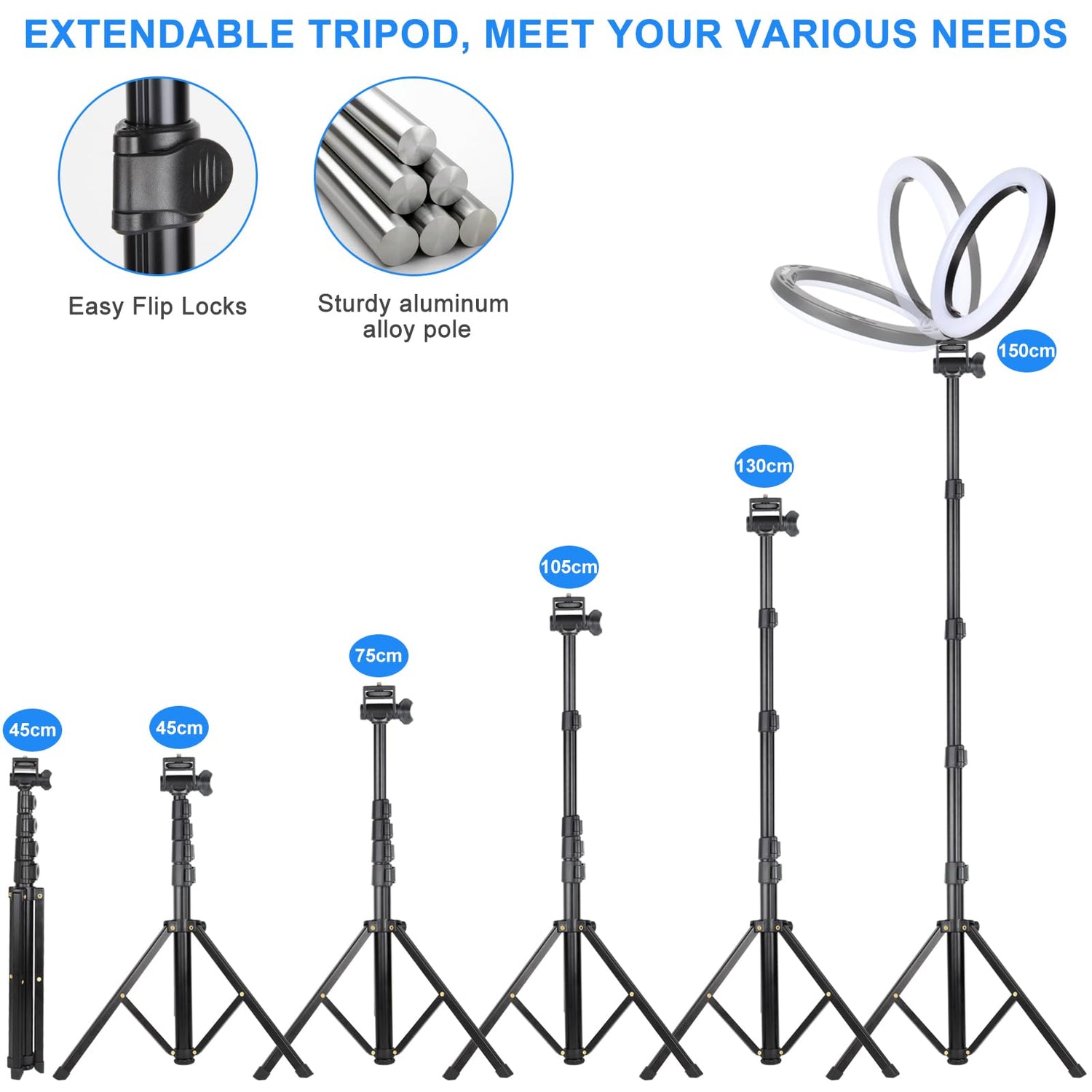 • Multifunktionsstativ - Das Stativ kann von 45cm bis 155cm reichen. Die Gesamthöhe unseres Ringlichts ist 180cm, was die Bedürfnisse von Menschen unterschiedlicher Höhe besser erfüllen kann. Der Stativständer lässt sich auch mühelos in einen Selfie-Stick umwandeln.