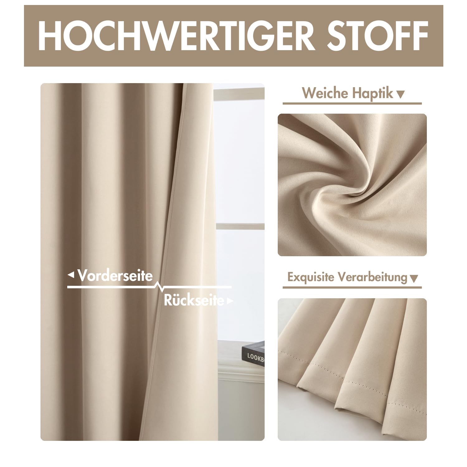 • Sie erhalten zwei Stücke von blickdichten Vorhängen in Beige, die jeweils 225 cm hoch und 140 cm breit sind. Um einen schönen Plissee-Effekt beim Schließen der Vorhänge zu erzielen, die Gesamtbreite der Vorhänge sollte mehr als zweimal so breit wie das Fenster sein. Die Vorhänge sollten länger sein als der Abstand von der Gardinenstange bis zum unteren Rand des Fensters. Wenn Sie einen hängenden Effekt bevorzugen, bei dem die Vorhänge den Boden berühren, können Sie längere Vorhänge wählen