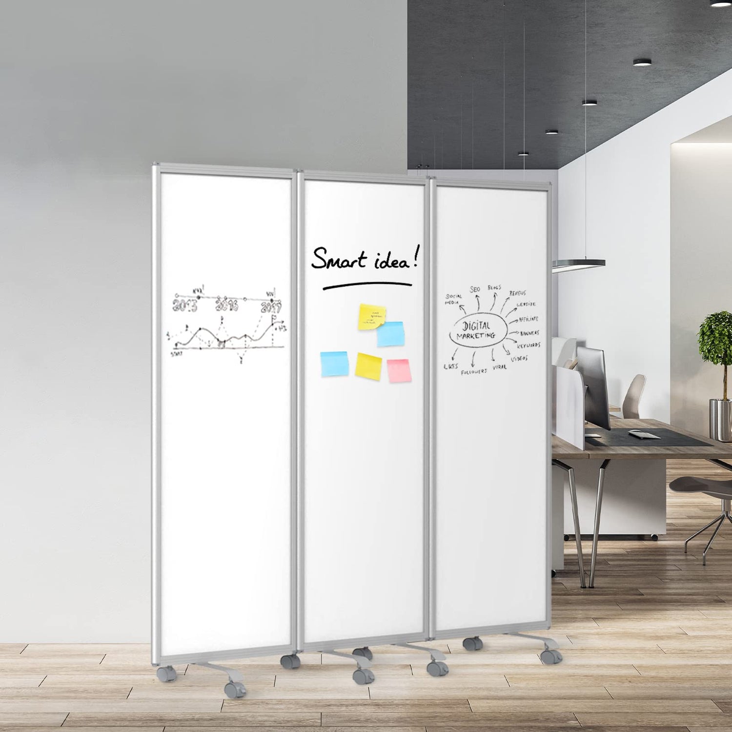 Einzelheiten: Mobiles Whiteboard in verschiedenen FarbenUnsere mobilen Trennwände bestehen aus bis zu drei Tafeln und einem robusten Aluminiumrahmen. Die einzelnen Tafelelemente sind flexibel verstellbar und lassen sich daher beliebig anordnen. Ob als Präsentationswand oder als Trennwand, mit unserem mobilem Raumtrenner sind Sie bestens ausgerüstet.Präsentationswand für die perfekte PräsentationAusgestattet mit drei doppelseitig nutzbaren Whiteboardtafeln und den am Fuß angebrachten Rollen, welche jeweils mit praktischer Feststellbremse ausgerüstet sind, kann die hochwertige Präsentationswand schnell und einfach bewegt und positioniert werden. Darüber hinaus sind die einzelnen Tafeln um 360° drehbar. Das ermöglicht eine flexible und vielseitige Präsentation. Jede Tafel ist zudem auch magnetisch.Mobiles Whiteboard mit robustem AluminiumrahmenDas Gesamterscheinungsbild der mobilen Moderationstafeln wird durch einen edlen und stabilen Aluminiumrahmen abgerundet. Dieser sorgt für einen sicheren Stand und ermöglicht gleichzeitig ein leichtes Fortbewegen, da Aluminium im Vergleich zu anderen Metallen deutlich leichter ist.Mobile Whiteboardtafel – Produkteigenschaften: Material: Aluminium, Kunststoff Farbe: Weiß, Weiß/Grau, Transparent Breite Schreibtafel (1-teilig): 90 cm Breite Schreibtafel (3-teilig): je 60 cm Höhe: 183 cm Gewicht (1-teilig): c.a 14 kg Gewicht (3-teilig): c.a 25 kg Magnetisch & abwischbar Mobile Rollen Einteilig und doppelseitig nutzbar