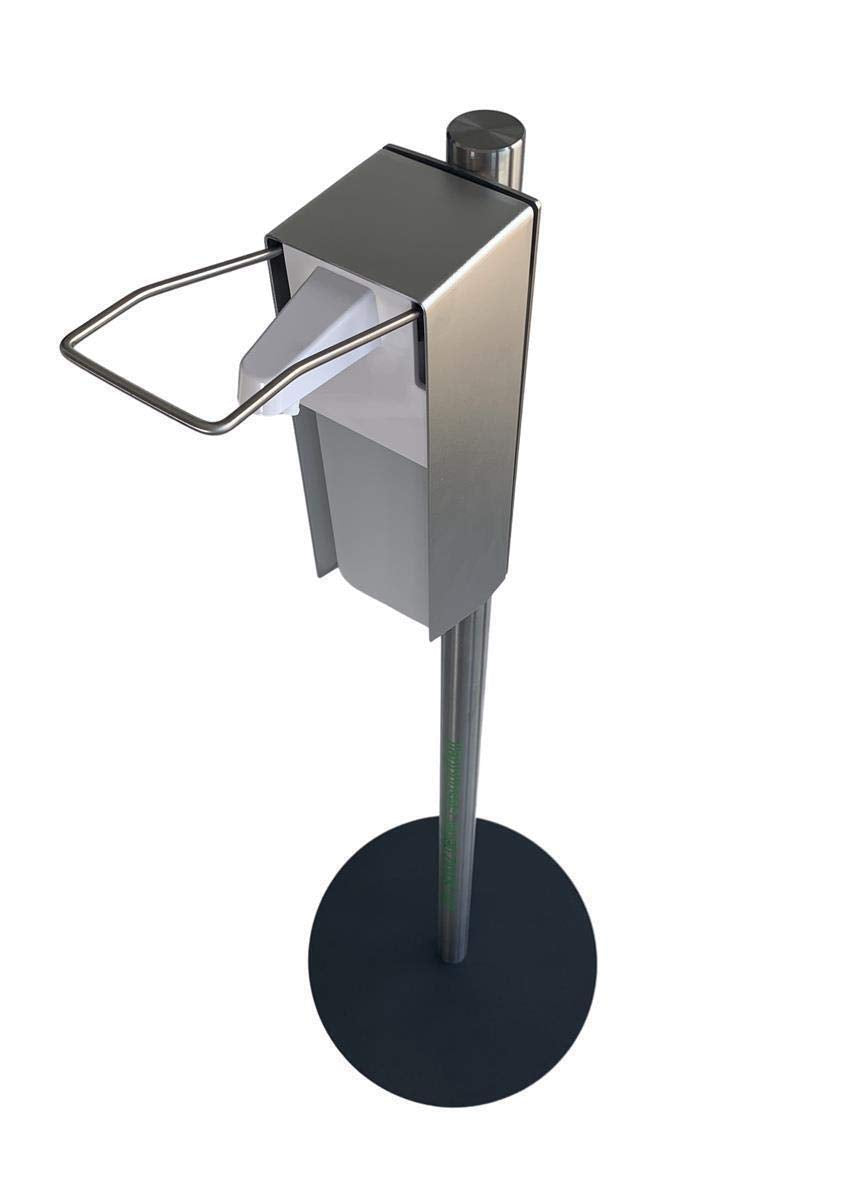 Extras: Premium Hygienespender für Gebäude mit hoher Besucherfrequenz | Flexibel z. B. im Eingangsbereich zu positionieren ohne bohren | Fester Stand durch schweren Stahlsockel | Bodenbelag Schutz | Made in Germany | Direkt vom Hersteller