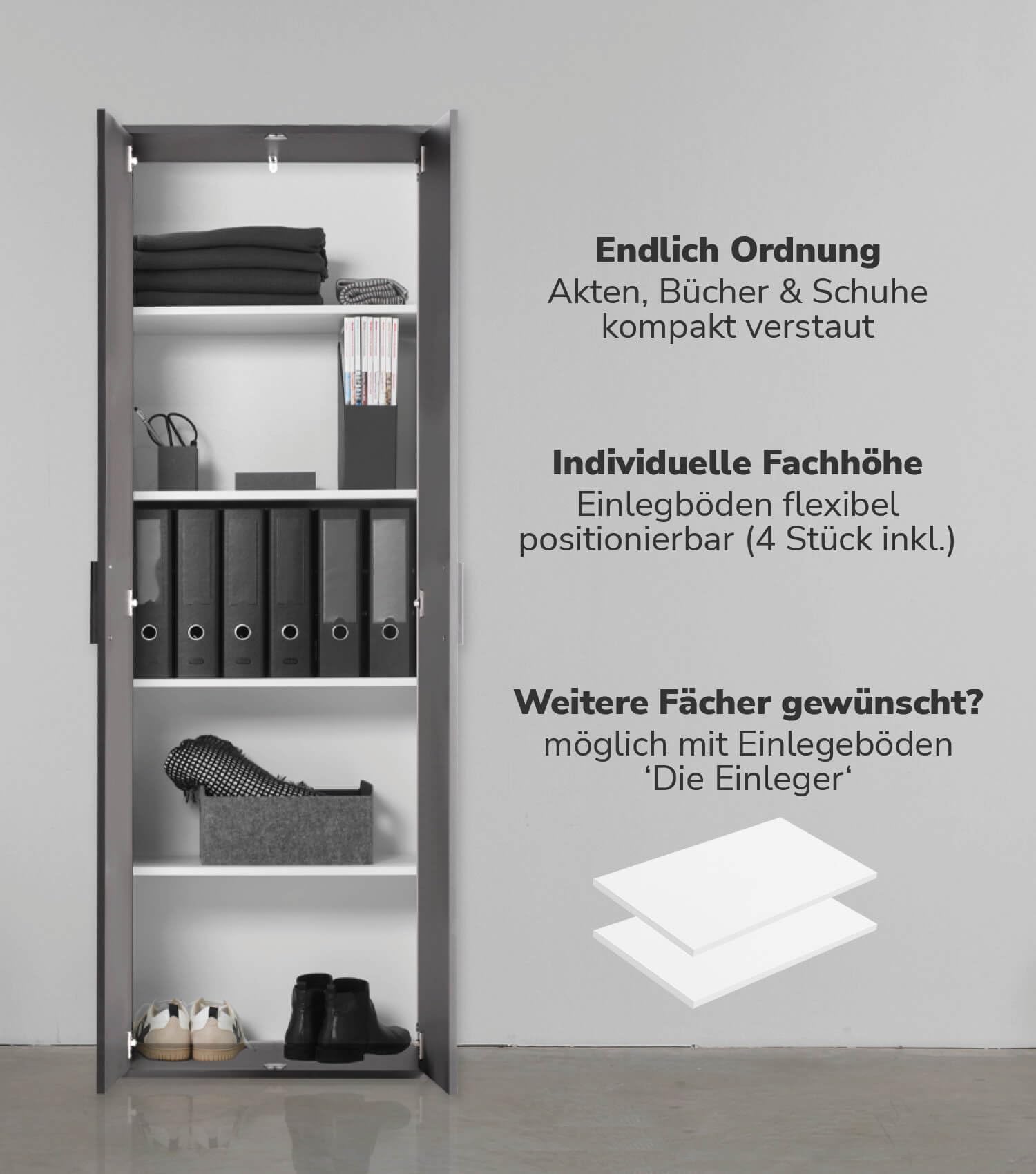 • INDIVIDUELLER STAURAUM! Ob Akten-, Garderoben- oder Putzschrank - wähle Ausstattung & Farbe, die am besten zu deinen Bedürfnissen passen. Neben vorkonfigurierten Fächern & Einlegeböden kannst du weitere mokebo 'Einleger' an +10 Positionen montieren.