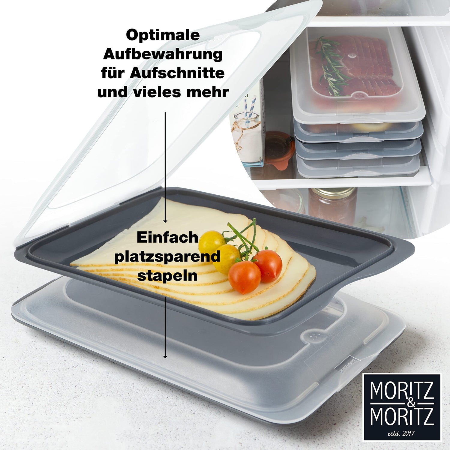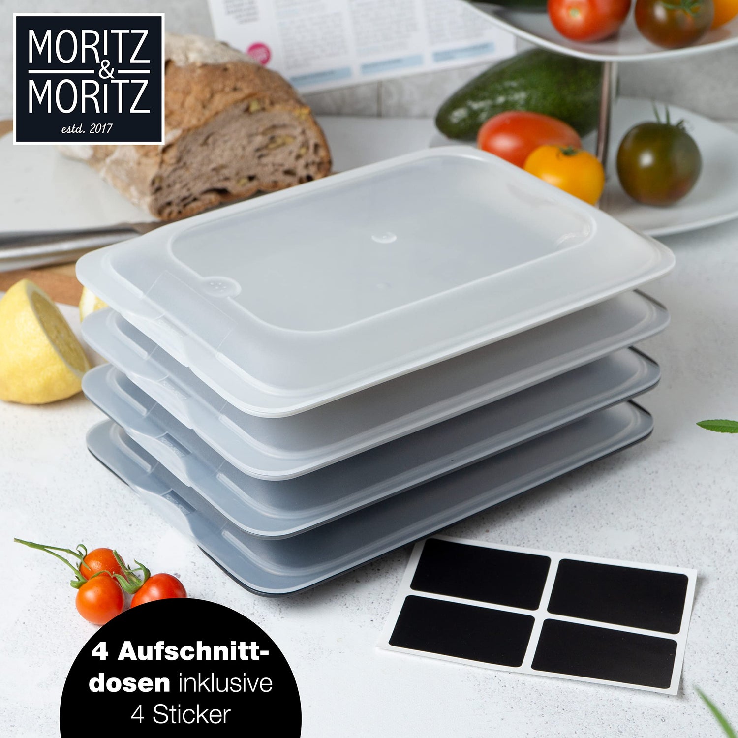 Moritz & Moritz 4er Set Aufschnittbox stapelbar – Frischhaltedosen mit Deckel zur Aufbewahrung von Wurst, Käse, uvm. – inkl. Tafelsticker zum Beschriften
