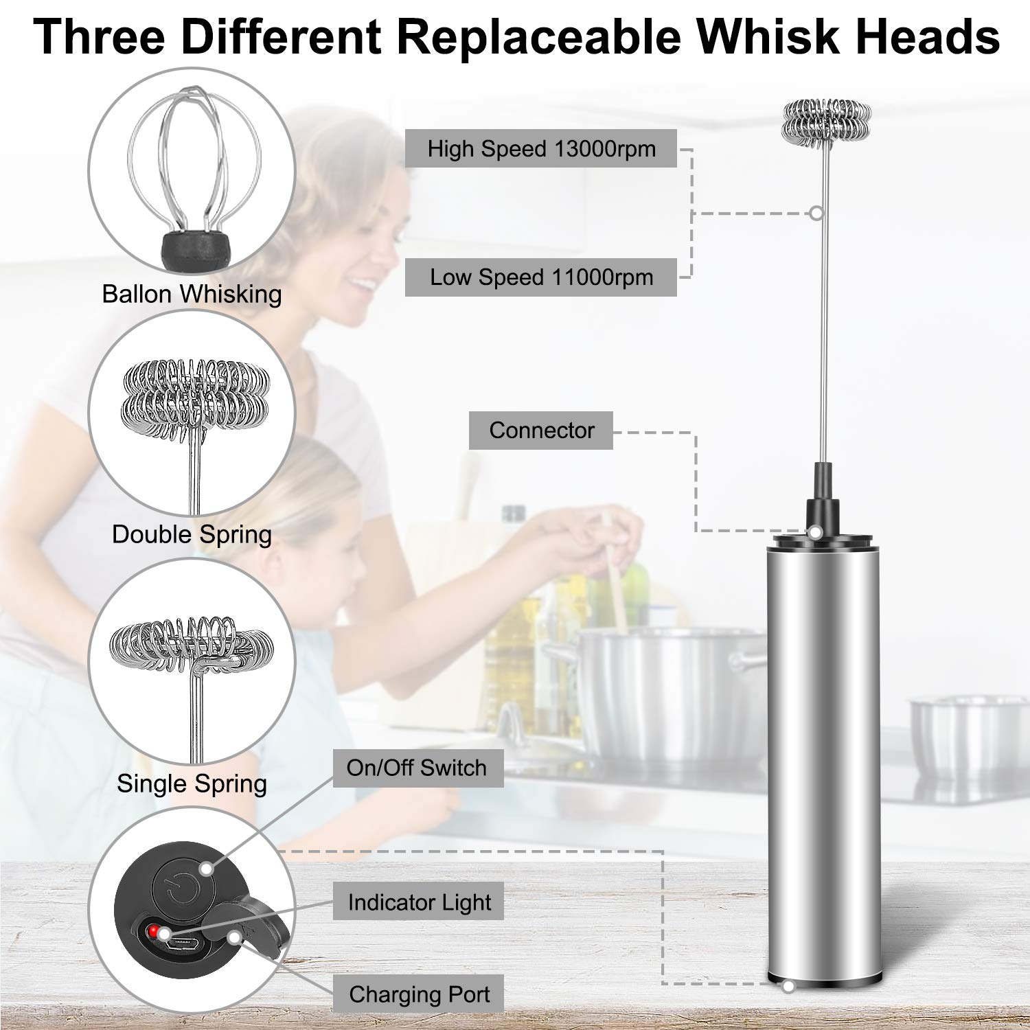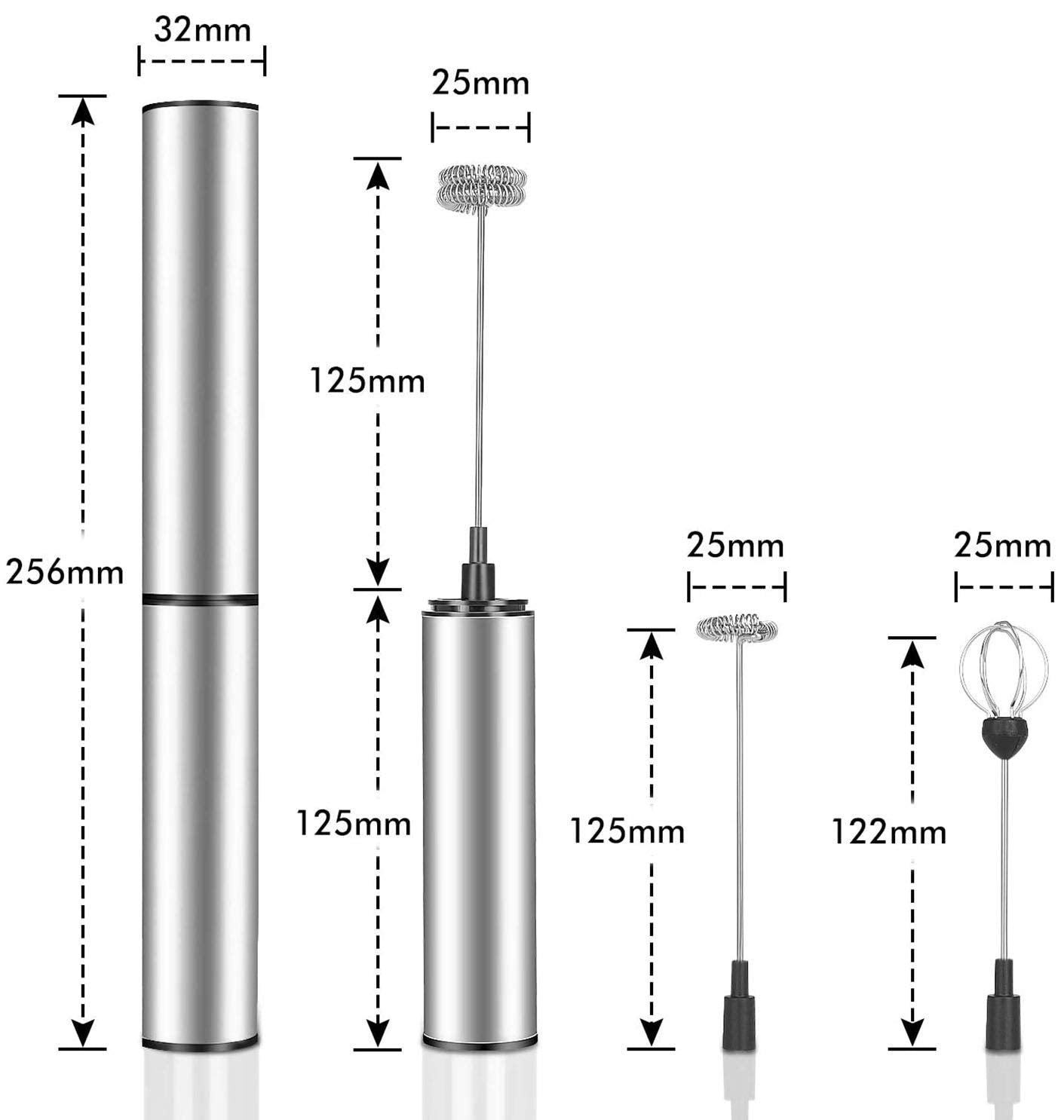 • 【Multifunktional Milk Frother】Der Aufschäumer kommt mit 3 Aufsätzen, die leicht aufzuwechseln sind. Die Aufsätze lassen sich leicht auf das Gerät aufschieben und entfernen. Wählen Sie den kleinen Schneebesen, um den perfekten Milchschaum zu erhalten. Außer Milchschaum kann man mit dem Teil Dressings zubereiten und auch Eier oder Saucen aufschlagen.