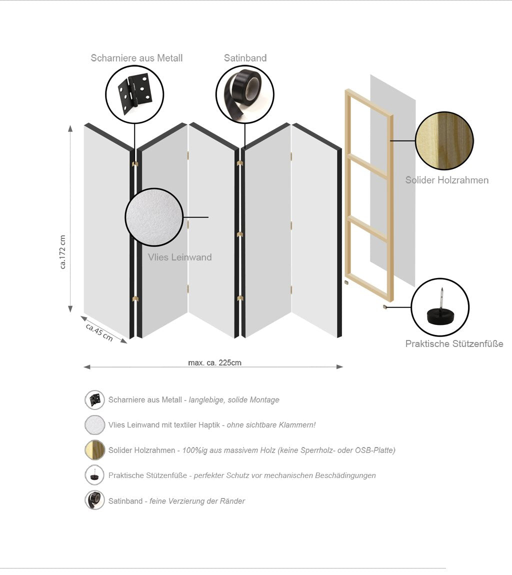 • Format: ca. 225x172 cm (Breite x Höhe) - 5-teilig (5 x ca. 45 x 172 cm) - einseitig bedruckter Paravent, Trennwand auf hochwertigem Vlies-Leinwand; Erhältlich in einer breiten Palette von Farben und Mustern