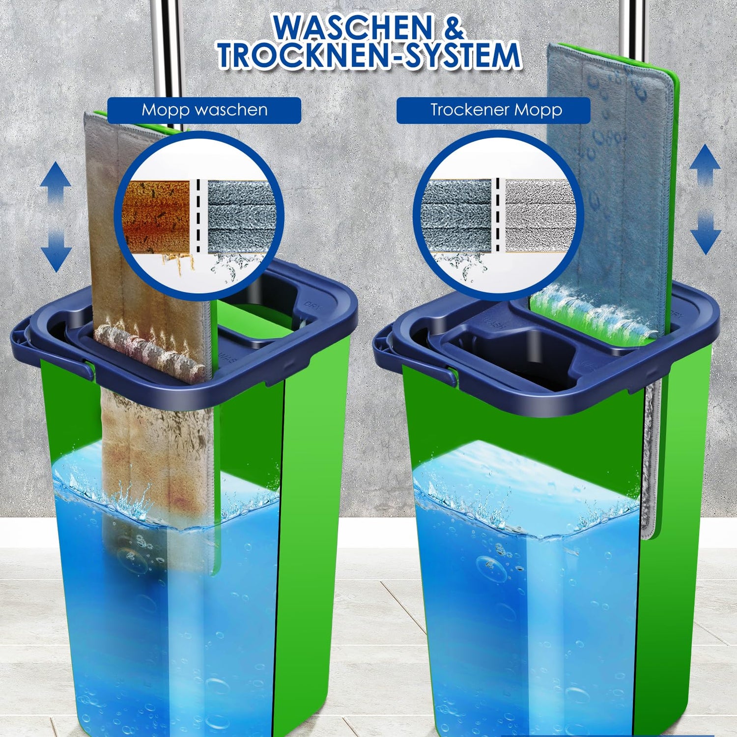 • 【Neu-Upgrade Moppkopf】Moppkopf kann 360°frei gedreht werden,leicht zu reinigende Ecken, unter Bett, unter Sofa. Der Moppkopf mit Klettverschluss und Verschlussknöpfen, das das Mopppad stabiler macht und weniger wahrscheinlich abfällt. Gummiabstreifer des Wischmopp mit Auswringfunktion entfernt überschüssige Feuchtigkeit, ohne die Oberfläche zu zerkratzen.