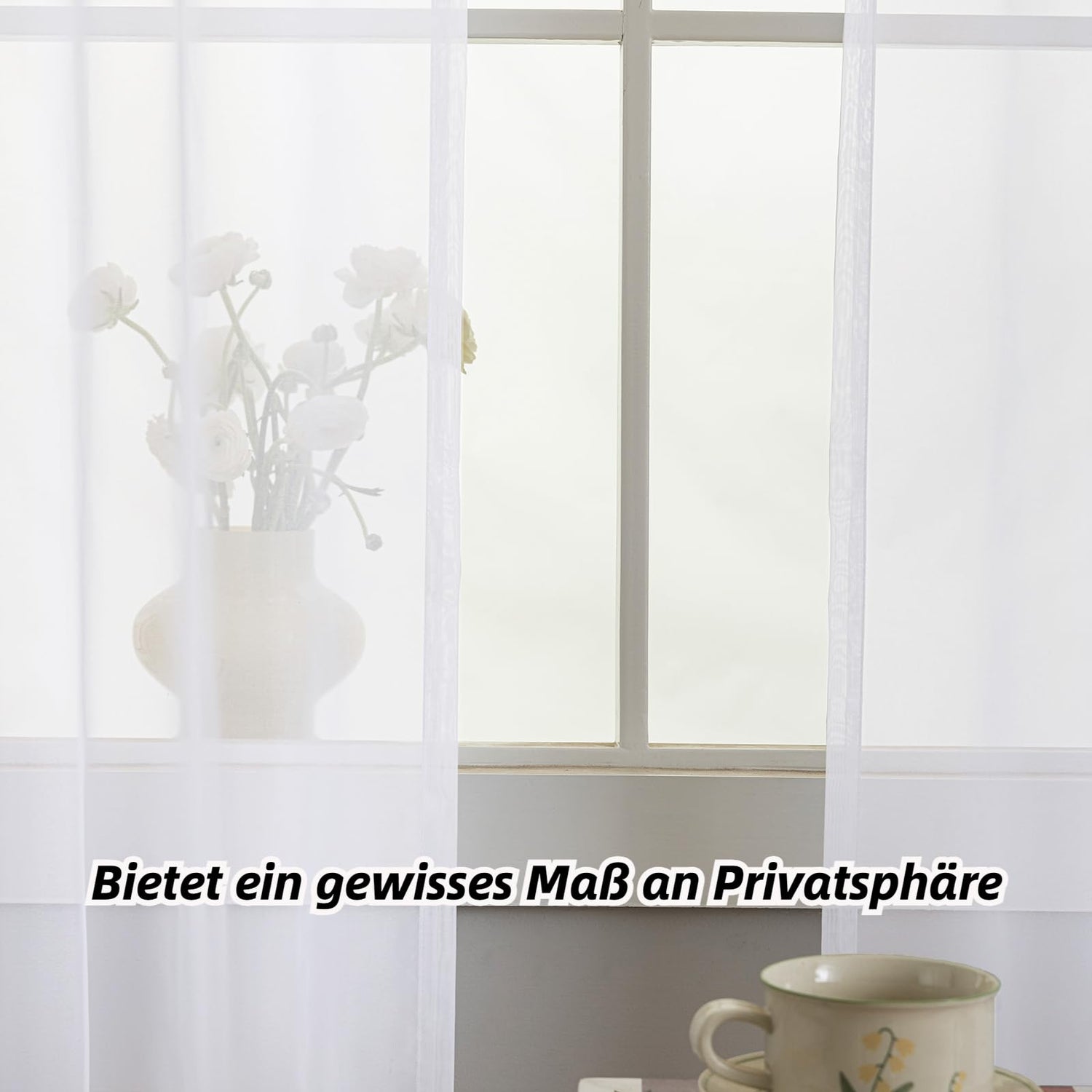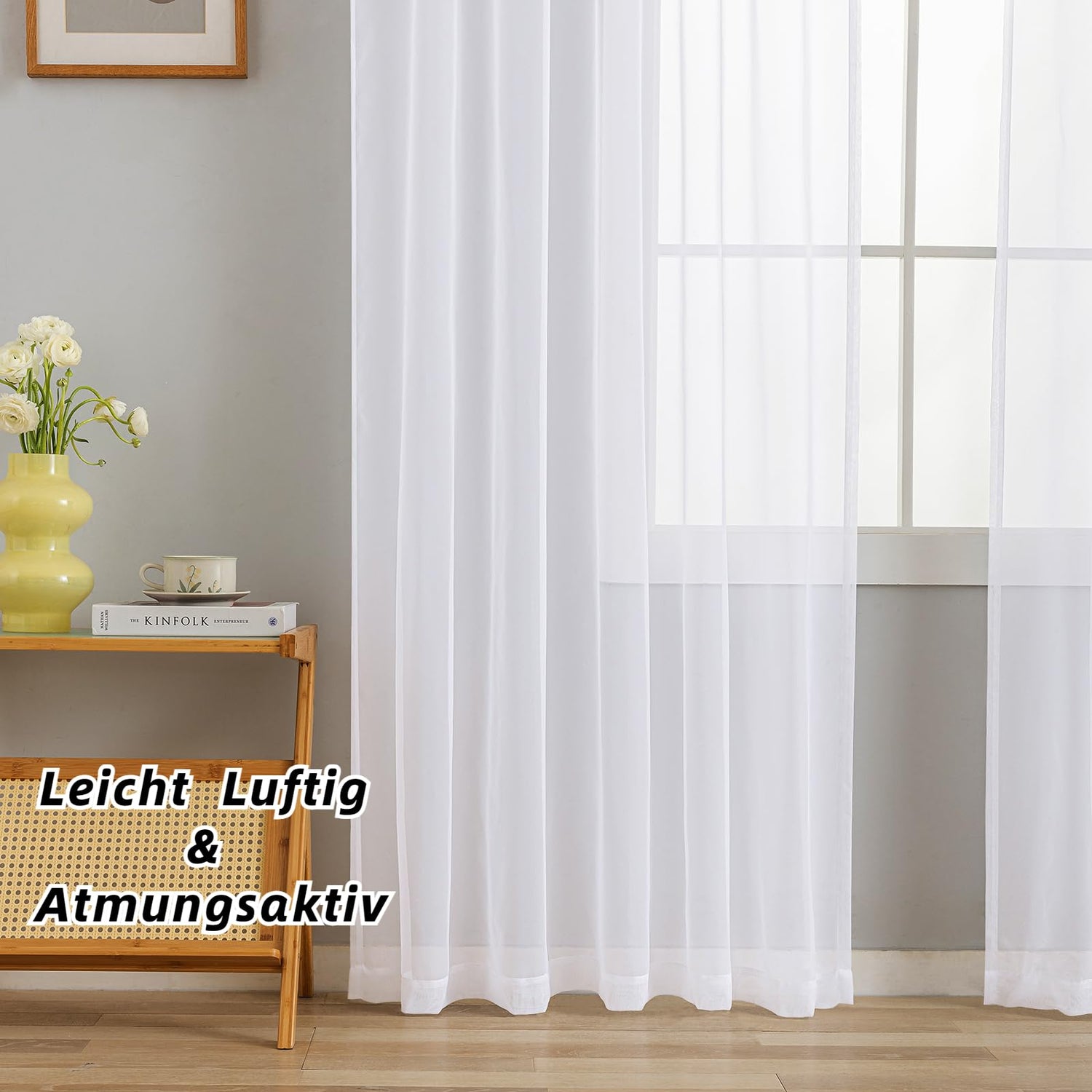 • Information zum Produkt: Jedes paket enthält 2 stücke weiße vorhänge. Jeder durchsichtige, weiße vorhang misst H245 x B140 cm (ohne Vorhangkopf) und die Gesamtfläche beträgt 245 x 280 cm (H x B). Dank der doppelten Gardinenbänder lassen sich diese weißen transparenten Voile-Gardinen luxuriös und elegant aussehen. Das speziell 5 cm breitere untere Band ermöglicht einen besseren Faltenwurf und kann durch Vorhangstangen gefädelt werden, wenn das Produkt als Türvorhang verwendet wird