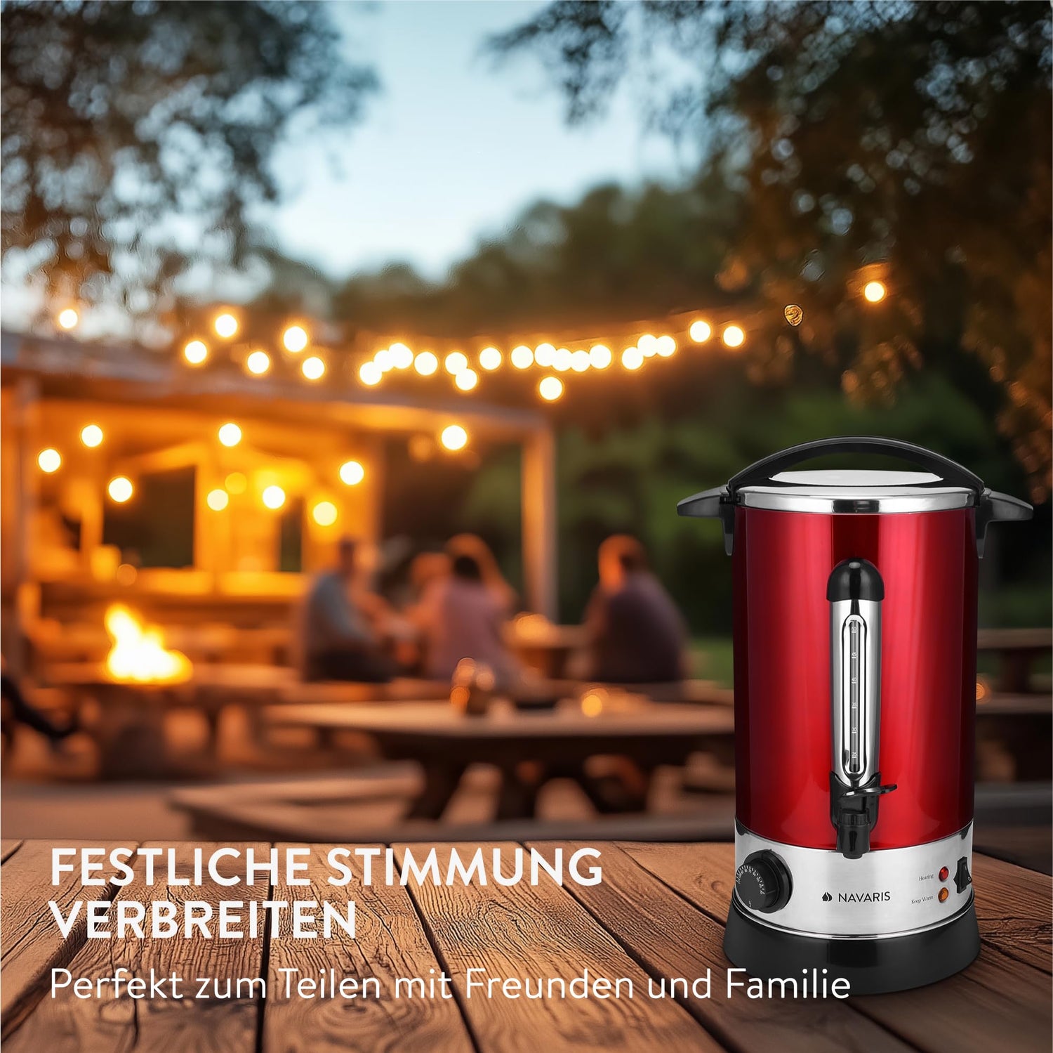 Vielseitiger Heißgetränke-Automat Der Navaris Glühweinkocher in ansprechendem Rot erhitzt und hält Getränke wie Glühwein, Punsch, Tee, Kaffee oder Wasser warm. Mit stufenloser Temperaturregelung von 30–110 °C und integriertem Zapfhahn ist er ideal für Partys oder gemütliche Abende.
