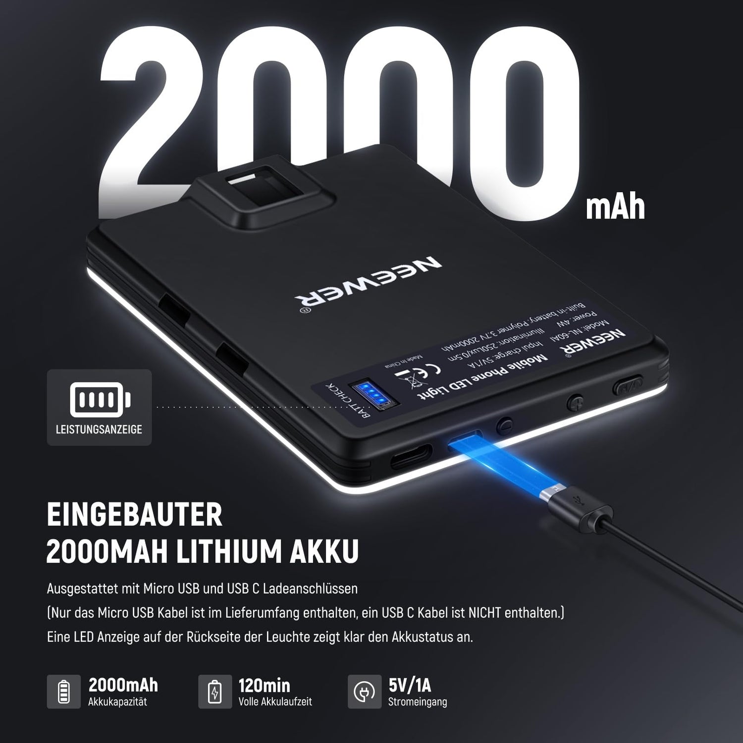 • 【Packungsinhalt】 1 × NL-60AI LED Videoleuchte, 1 × Frontkamera Clip, 1 × Telefonhalterung, 1 × Mirco USB Kabel, 1 × Benutzerhandbuch