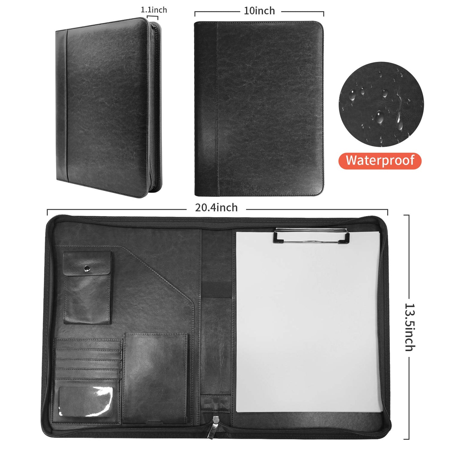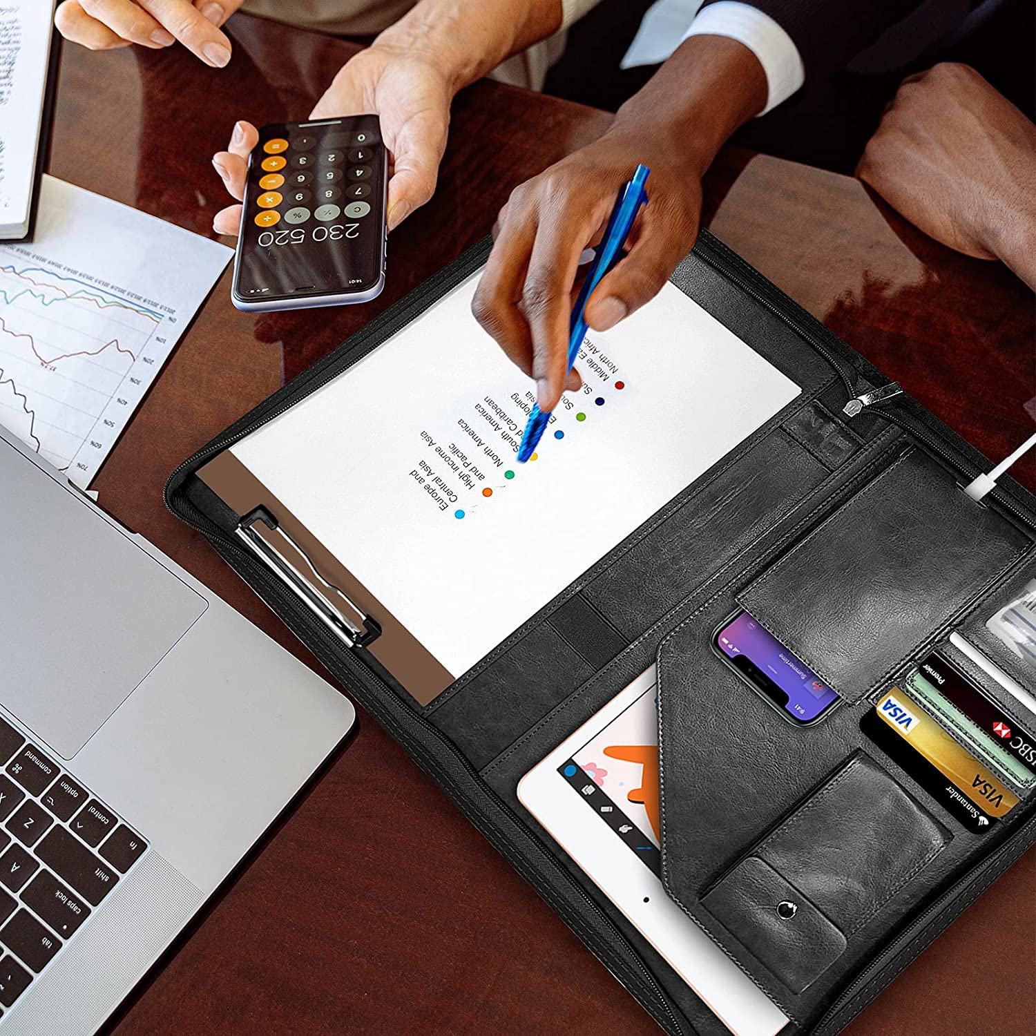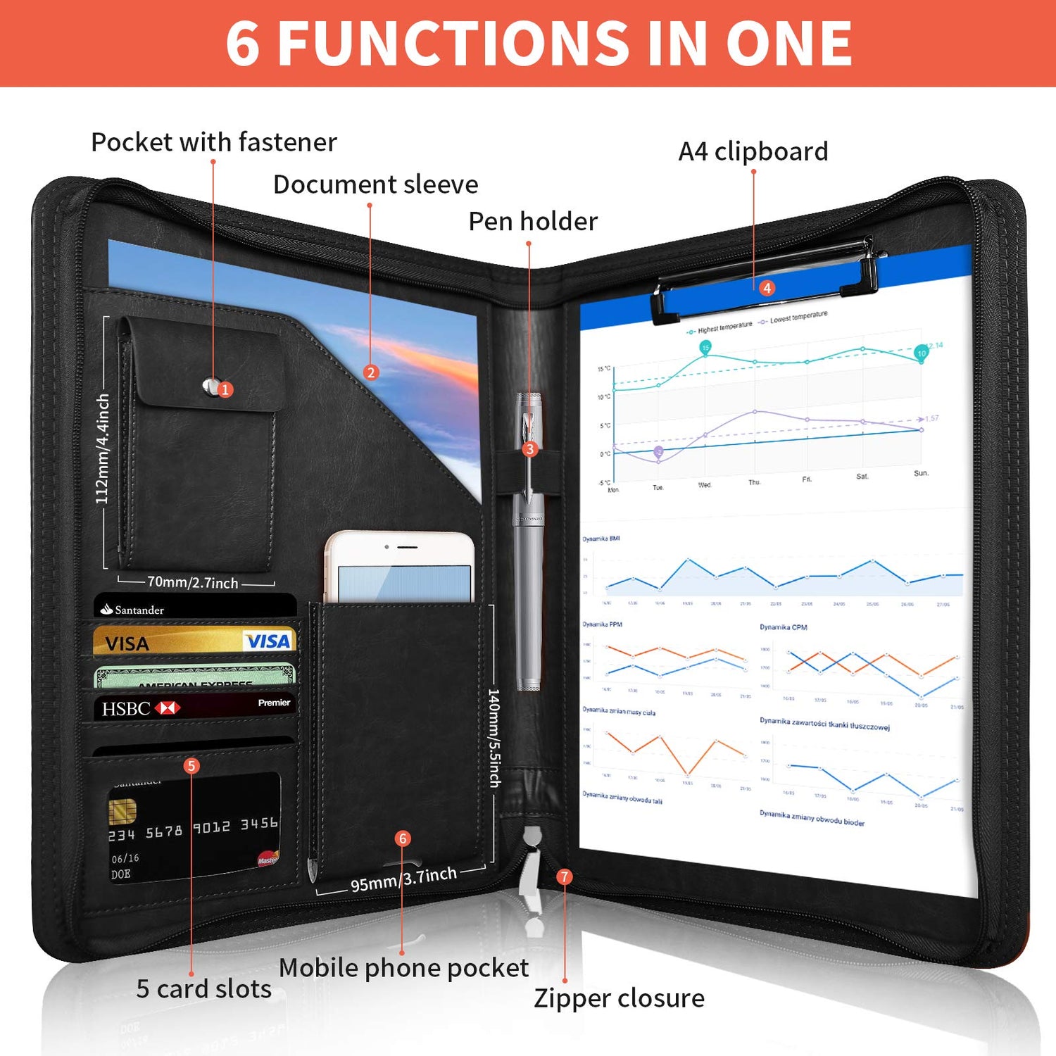 • Große Kapazität: Dieser Portfolio-Organizer ist gut ausgestattet mit einem A4-Klemmbrett, 5 Kartenfächern mit Ausweisfenster, einer Handytasche, einer Zubehörtasche mit Druckknopflasche, einem Stifthalter und einer Tablet-Hülle. Perfekt funktional für den täglichen Gebrauch.
