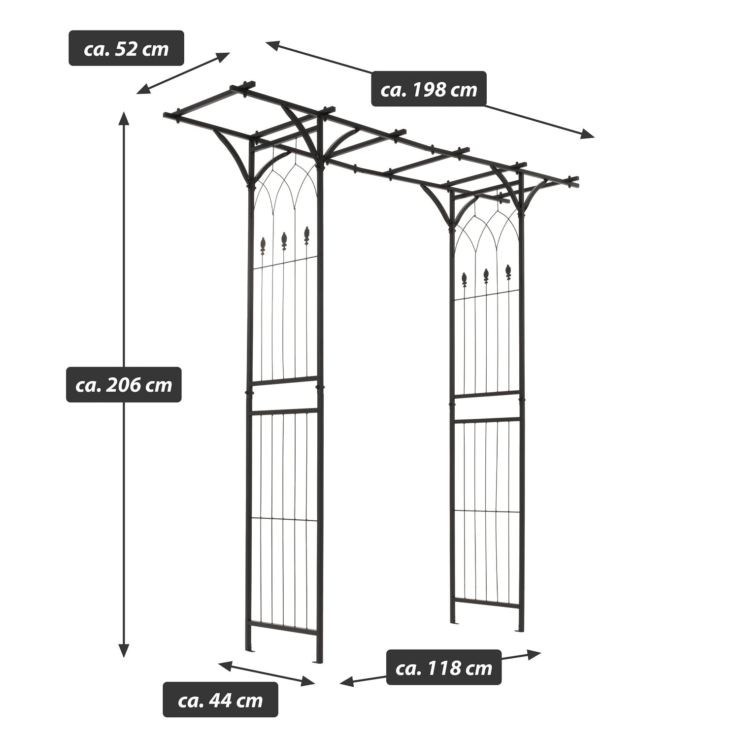 • Die Gesamtmaße dieses Gartentors betragen: Höhe ca. 206 cm x Breite 198 cm x Tiefe 52 cm. Ergänzen Sie Ihre Gartenausstattung mit einer zum Rosenbogen passenden Essgruppe, einem Bistro-Set oder einem Sonnenschirm.
