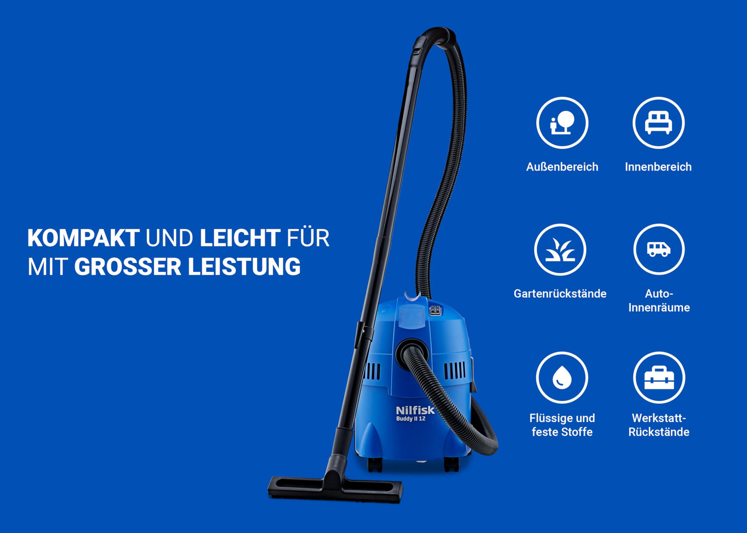 - NILFISK NASS-/TROCKENSAUGER: Der Buddy II 12 Nass- und Trockensauger verfügt über eine hervorragende Saug- und Blasleistung, um nasse und trockene Ablagerungen aus Ihrem Haus, Garten, Ihrer Werkstatt oder Ihrem Auto zu entsorgen.
