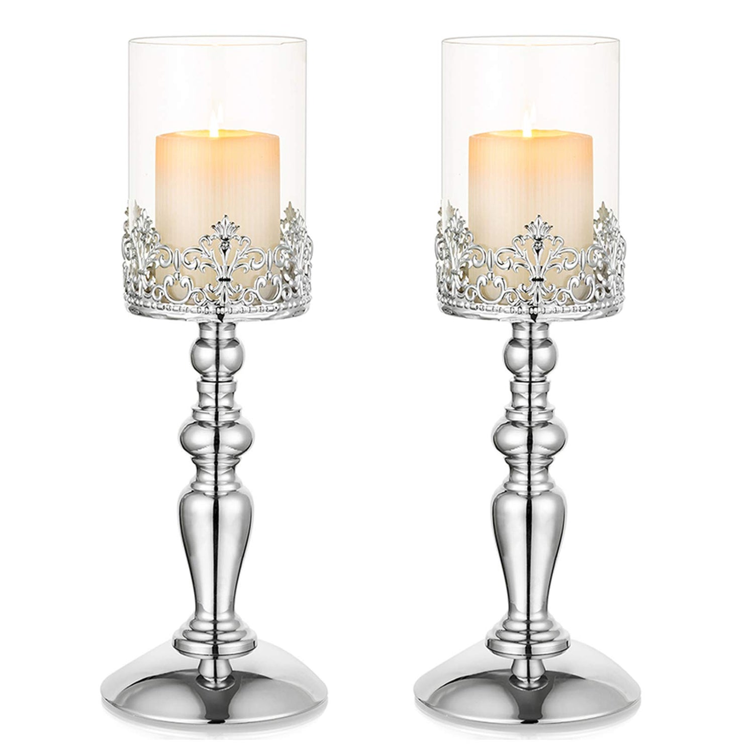 NUPTIO 2 Stück Silber Säule Kerzenhalter mit Glas, Hurricane Kerzenhalter, 32cm Hoch Kerzenlichthalter für Hochzeitstag Einweihungsfeier Weihnachtsfeier Tisch Kamin Mantel Mittelstücke