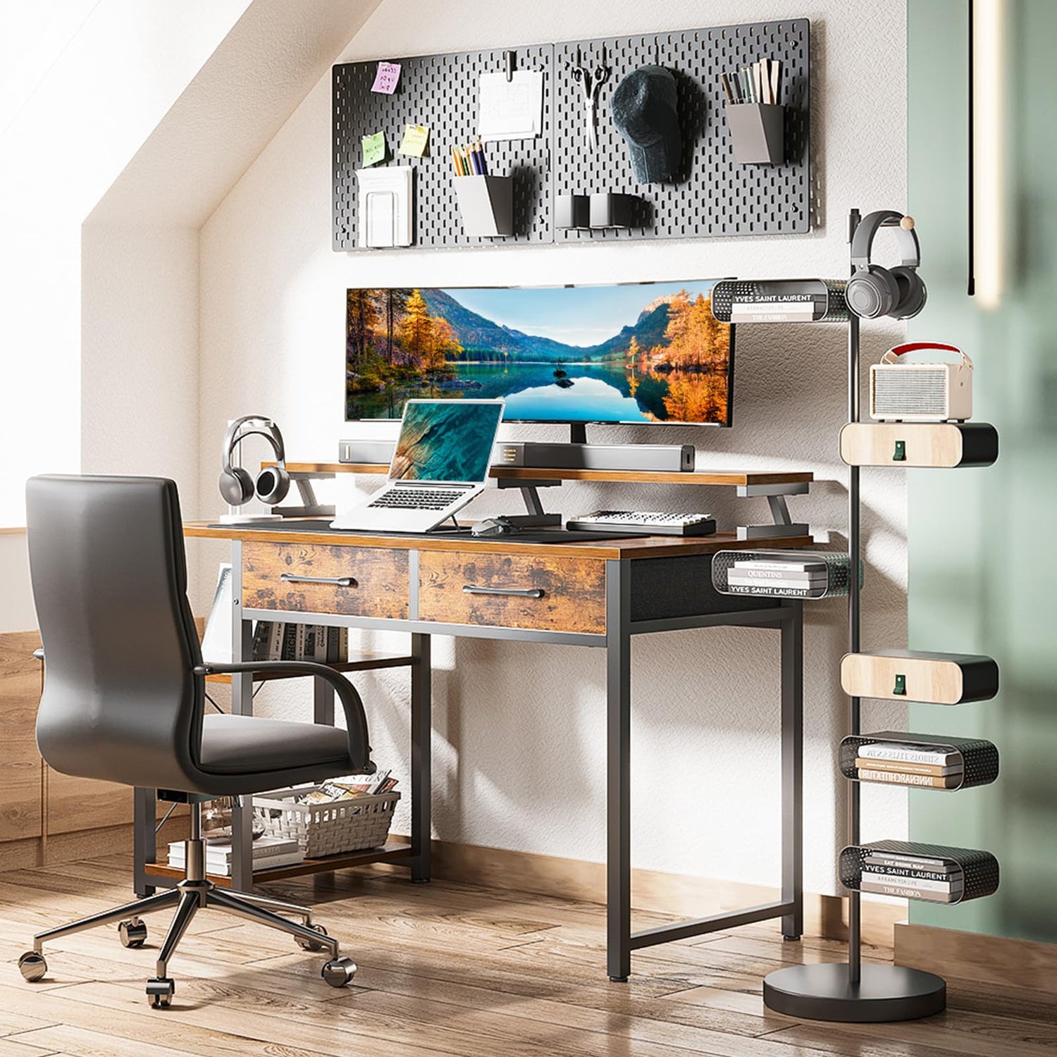 • 【Kleiner Schreibtisch mit Monitorständer】schreibtisch mit regal Der 9,9 cm hohe Monitorständer hebt den Bildschirm an und ermöglicht eine bessere Sicht, reduziert Nacken- und Rückenschmerzen und schafft zusätzlichen Stauraum. Der große Platz für den Monitorständer ermöglicht zwei Computermonitore.