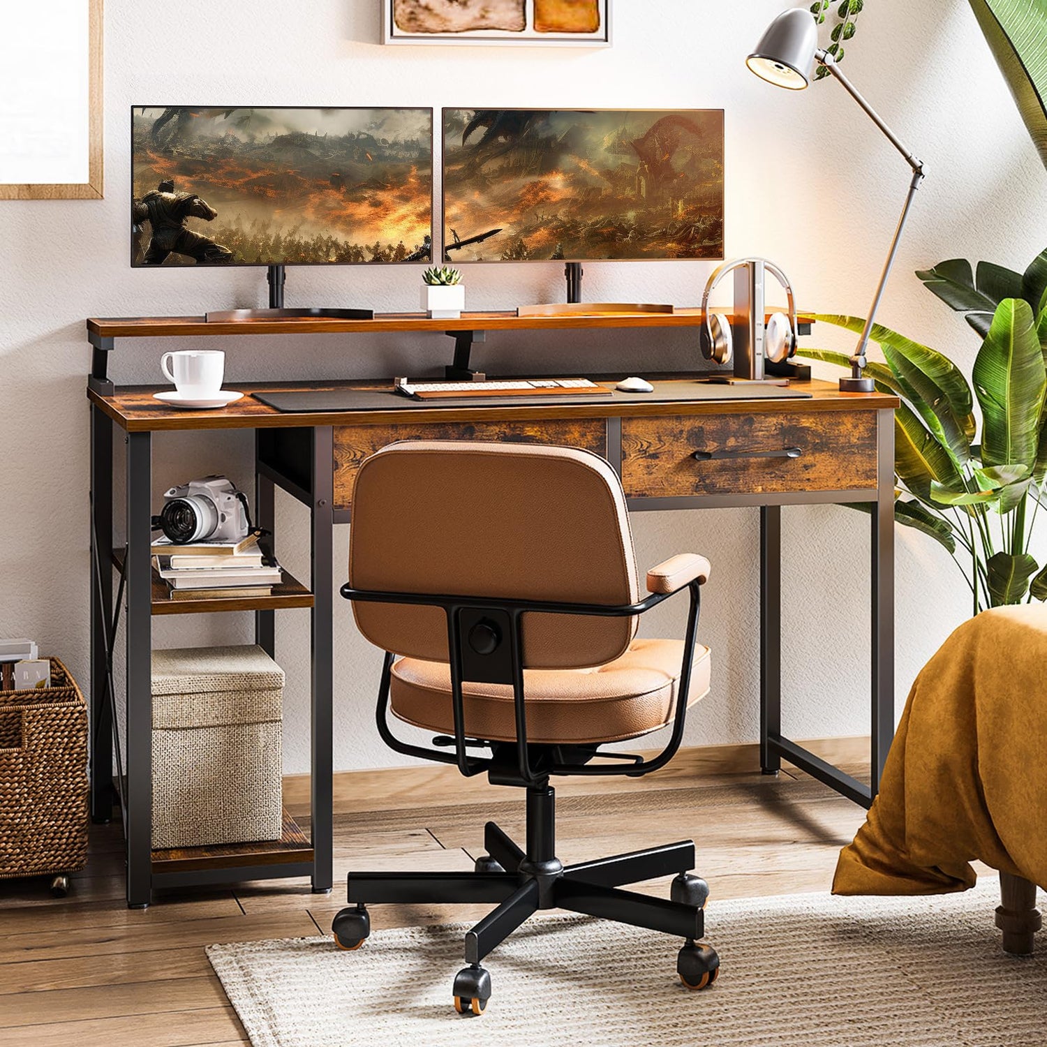 ODK Schreibtisch mit 2 Schubladen, Computertisch mit Regalen und Monitorständer, Bürotisch mit Bücherregal, Computertisch Klein PC-Tisch Officetisch für Home Office, 120x50x87cm, Rustikales Braun
