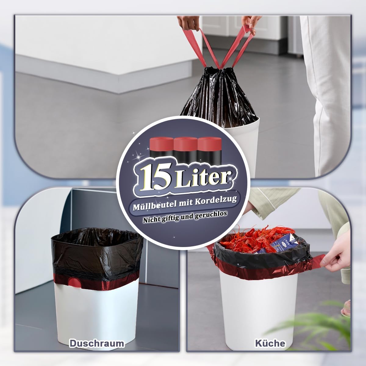 OKKEAI Schwarz Müllbeutel 15L mit Zugband Kleine Mülltüten,75 Stück Reißfest Müllsacks