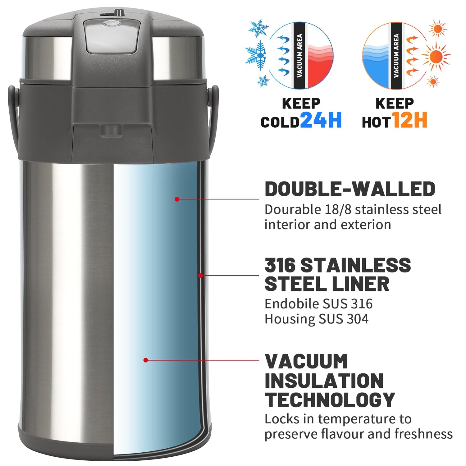 Titel: Olerd 4-Liter Pumpthermoskanne, Silber, Edelstahl-Doppelwand mit Vakuumisolierung, Kaffeespender mit Pumpmechanik für Warm und Kalt