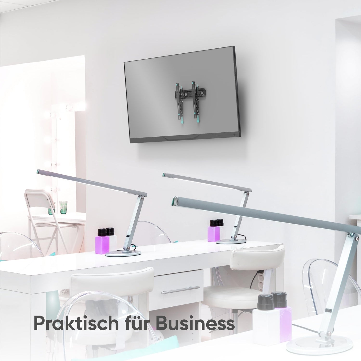 • UNIVERSAL WANDHALTERUNG FÜR TV | Fernseh Wandhalterung universal ist für Büro und Zuhause geeignet | Man kann die Fernseher Halterung Wand auch in Kundenbereiche oder Cafés installieren | Neigbare TV Wandhalterung super slim ermöglicht es, den Zugang zum Fernseher für Haustiere und Kinder einzuschränken | Halterung Wand Fernseher macht Platz unter dem Bildschirm frei