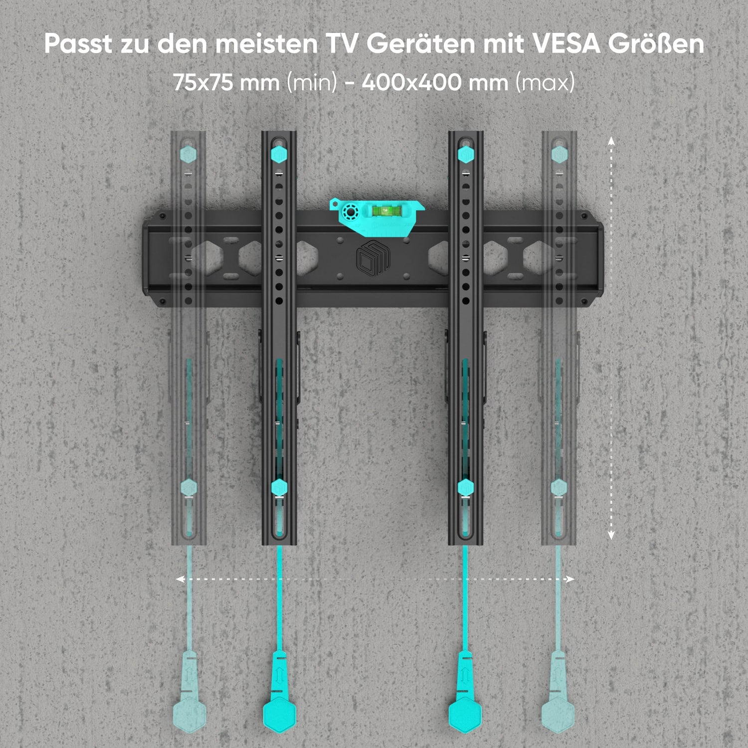 • TV HALTERUNG FLACH | Mindestabstand der TV Halterung neigbar zur Wand beträgt nur 35 mm | Universal TV Wandhalterung slim neigbar ist im Interieur fast unsichtbar | Kunststoffabdeckungen an den Seiten verleihen der Fernseher Aufhängung ein elegantes Aussehen | Eingebaute Wasserwaage erlaubt das Ausrichten der VESA Wandhalterung TV slim