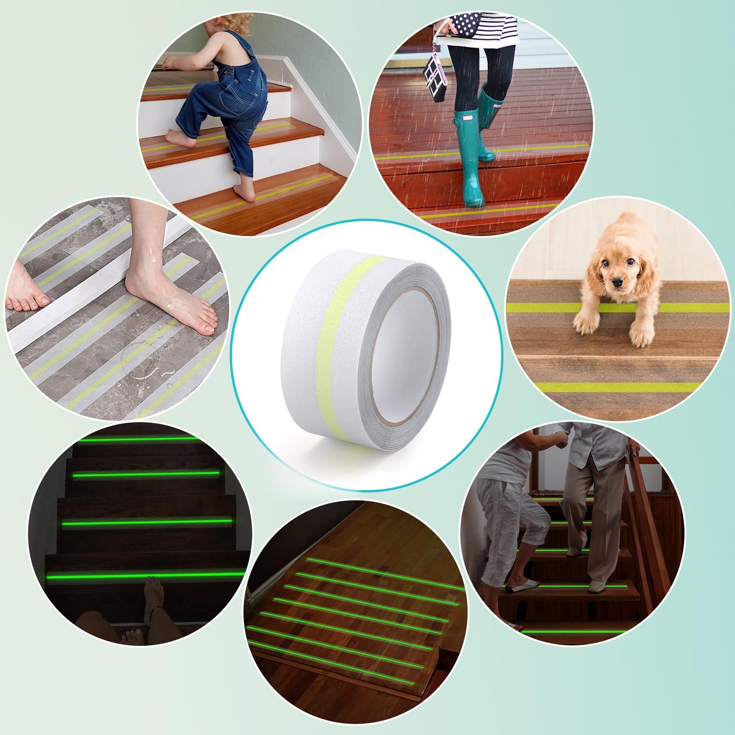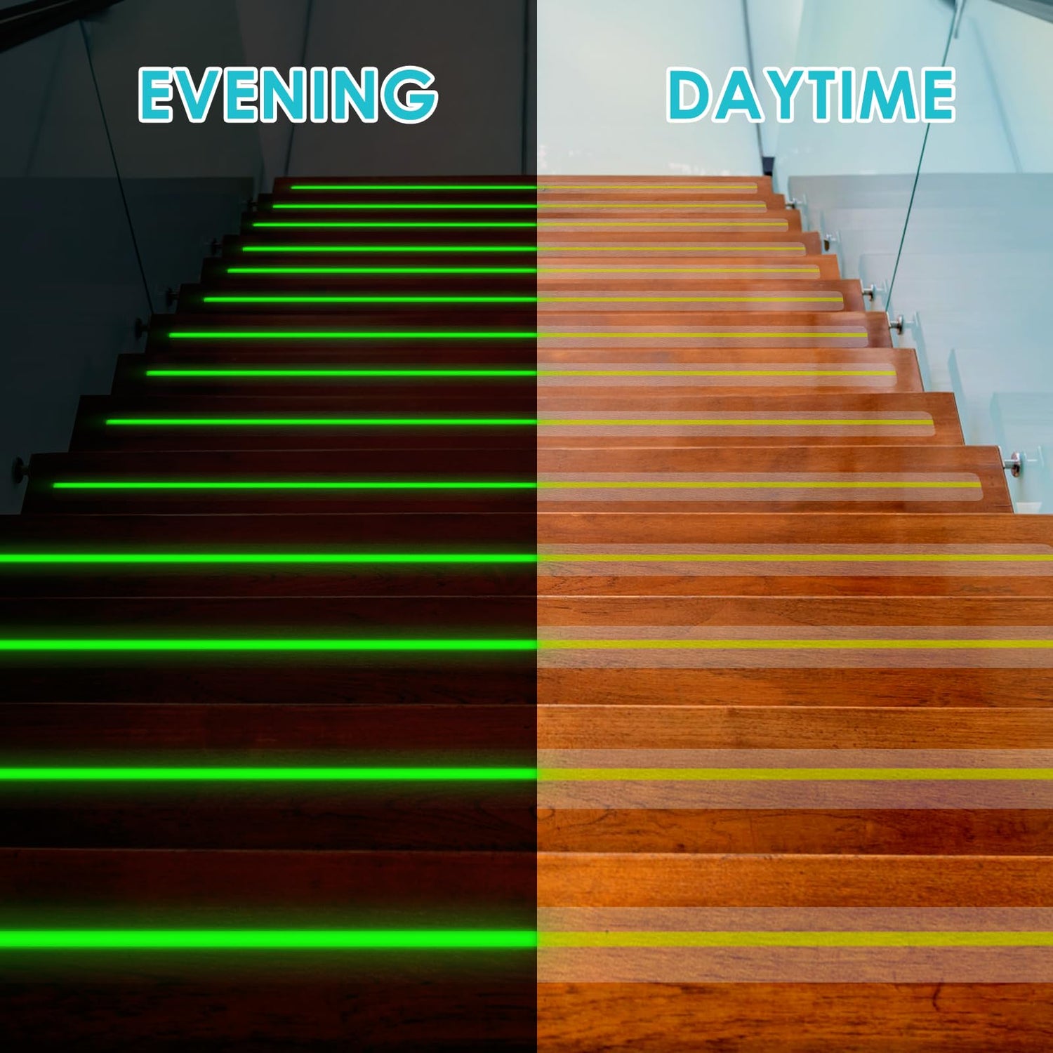 - 2.【Glow-in-the-dark Reminder】Das Band hat einen 6mm breiten grünen fluoreszierenden Streifen, der automatisch Energie unter jeder Lichtquelle akkumuliert und im Dunkeln leuchtet, so dass der Rand der Schritte auf einen Blick sichtbar ist und ein Ausrutschen in der Nacht verhindert.