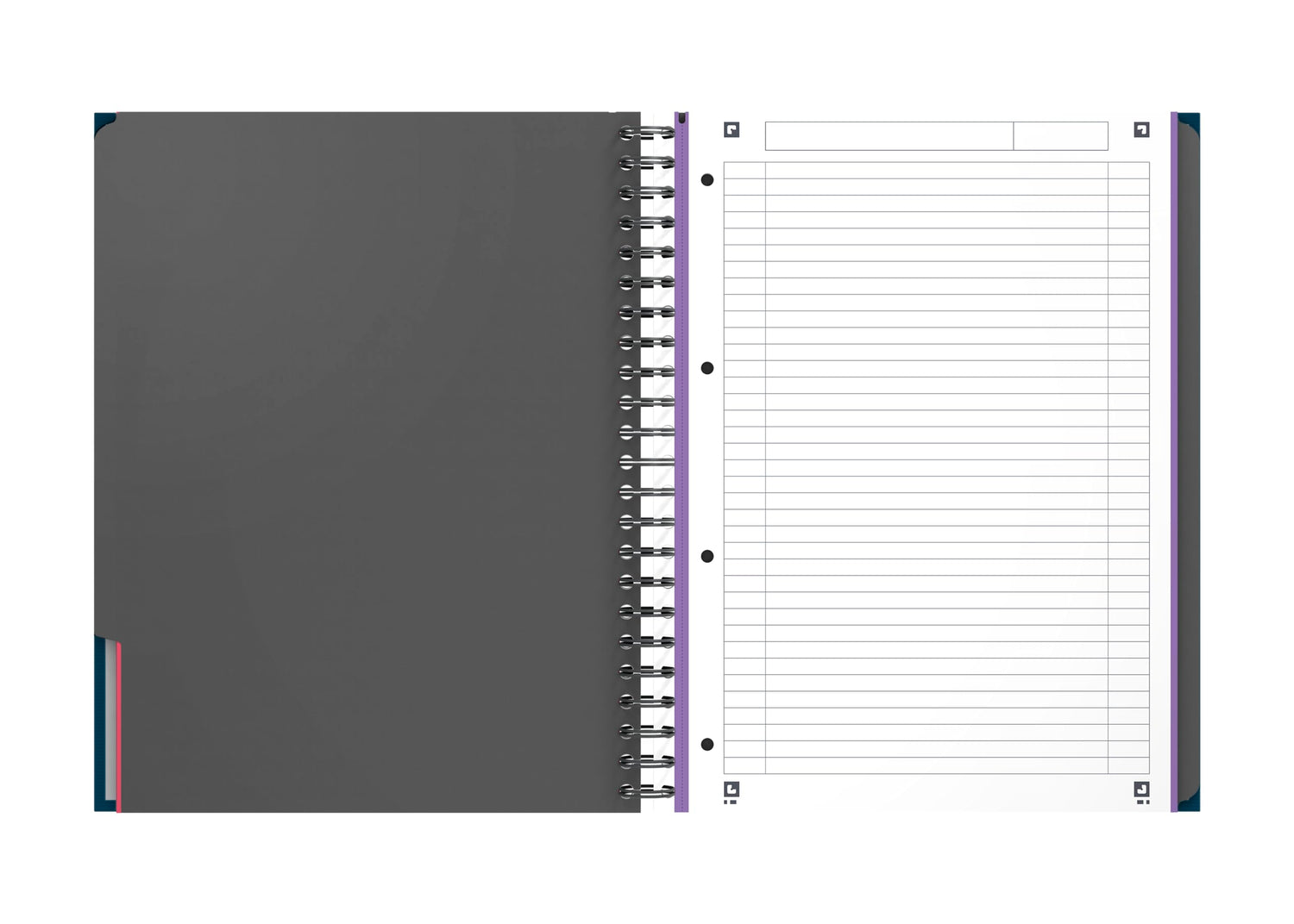 • Der 4-fach gelochte Block ist liniert mit Kopfzeile für Meetingtitel, Thema und Datum und Doppelrand, um Stichpunkte zu numerieren oder hervorzuheben