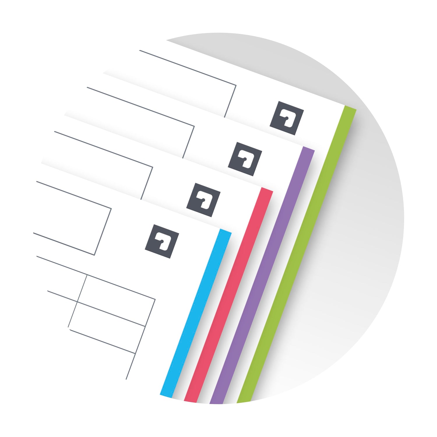 • Die Seitenränder besitzen vier verschiedene Farben, mit 3 versetzbaren Polypropylen-Registern die eine Unterteilung in bis zu 4 Bereiche ermöglichen