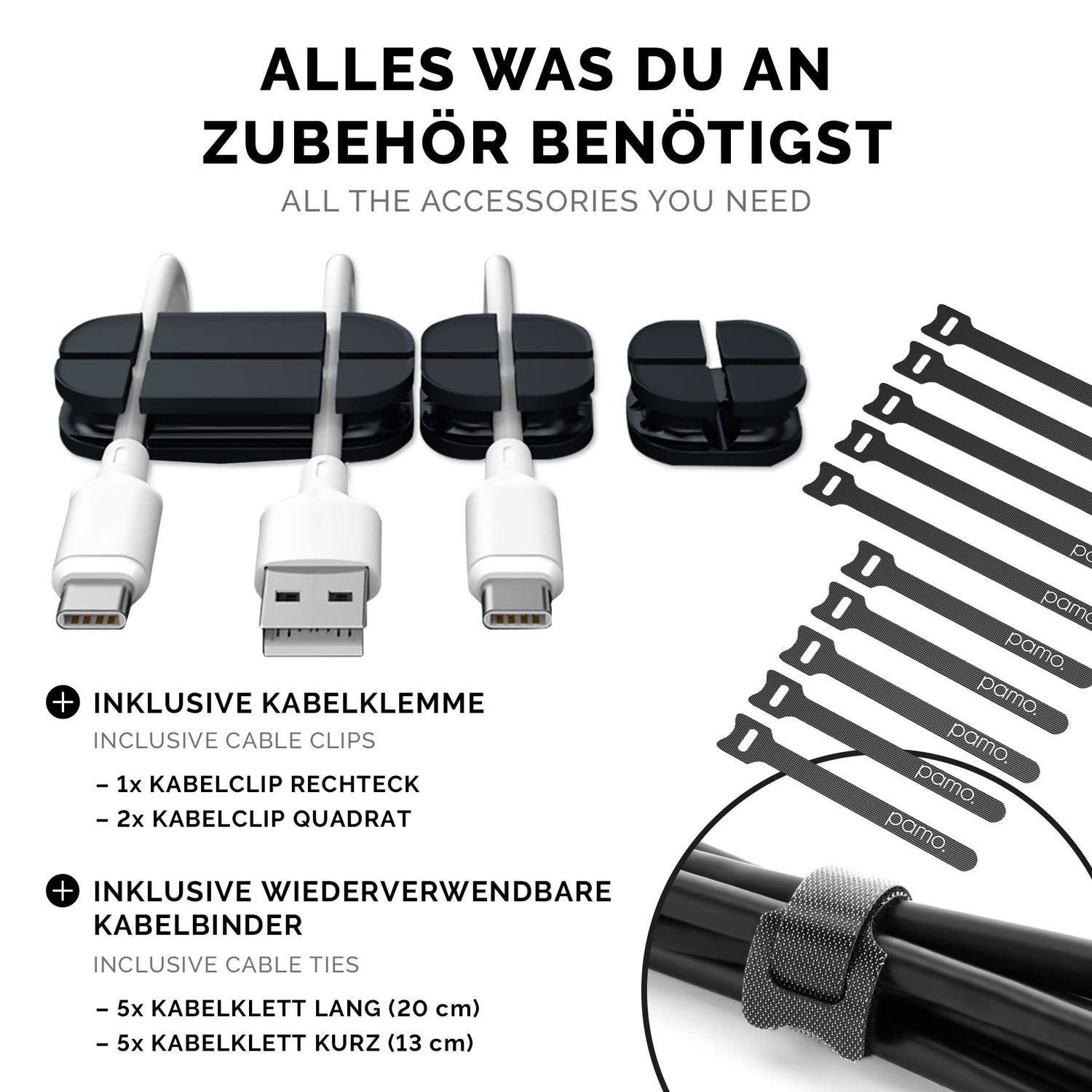 • ZUSATZ KLETT KABELBINDER - Zu unserem premium desk Kabel organizer sind im Lieferumfang 10x Klettkabelbinder und Kabel-Clips zum bündeln deiner Kabel enthalten. Perfektes Zubehör zur pamo Kabelbox Halterung. Maße Kabelkanal: 3St. je 44x10x12cm