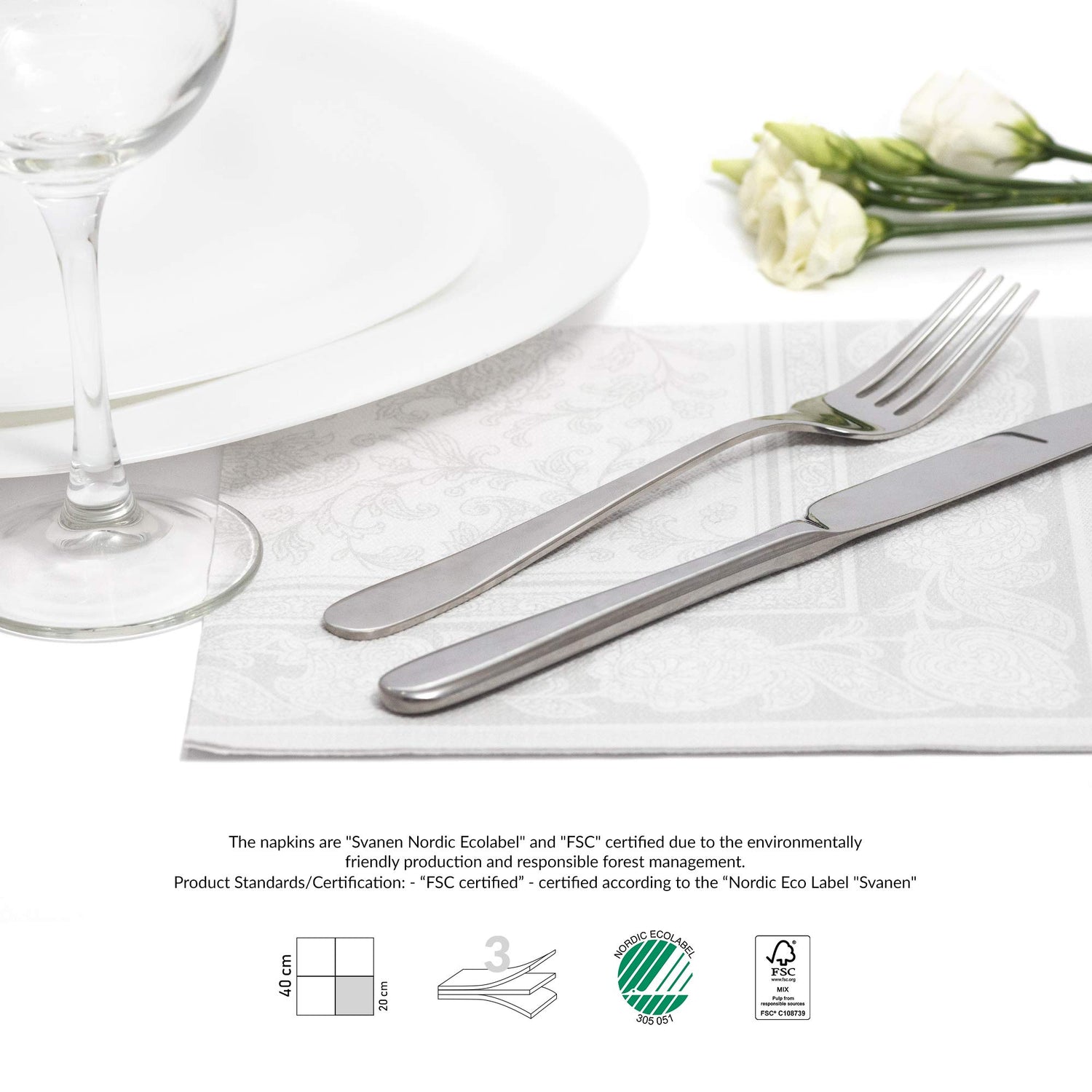 Einzelheiten: Papstar Servietten "Royal Collection", "Ornaments", weiß, 1/4-Falz, 40 x 40 cm (50 Stück). Die edlen Tissueservietten werten den gedeckten Tisch optisch auf und verleihen in der Gastronomie, im Haushalt oder auf Festen einen besonderen Flair. Unser Produkt hat folgende Produktzertifizierungen: FSC-Zertifizierung, sowie "Nordic Ecolabel Svanen". Die Zertifikate stehen für verantwortungsvolle und nachhaltige Waldbewirtschaftung. Für Ihre Tischdekoration empfehlen wir auch andere Produkte der Marke Papstar: Kerzen, Tischunterlagen, Tischtücher, Geschirr und vieles mehr. Auf dem Foto gezeigtes Dekorationsmaterial wird nicht mitverkauft. Farben können je nach Monitoreinstellung oder produktionsbedingt vom Foto abweichen.