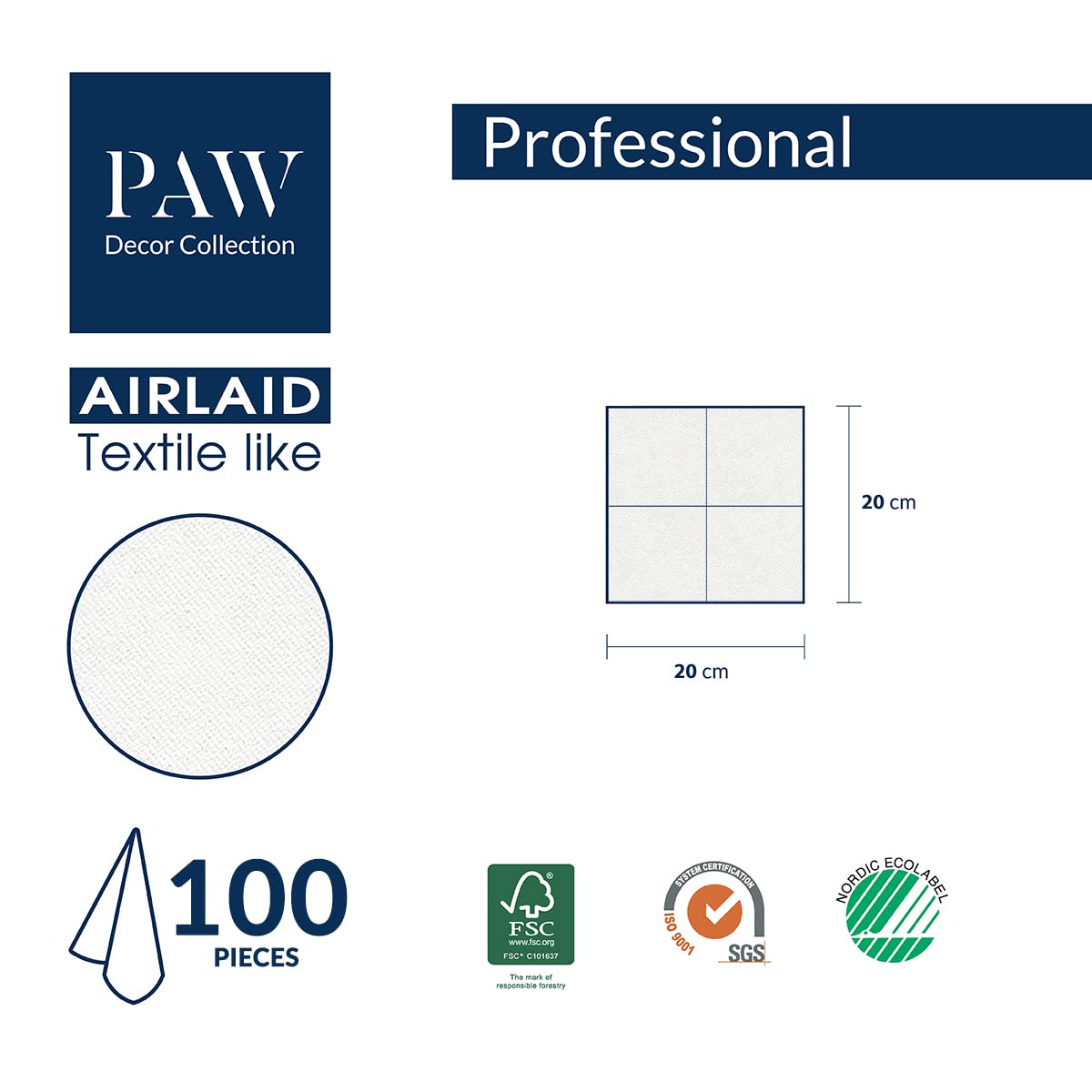 • PAW Professional ist eine Marke, die sich sowohl an das Gastgewerbe und die Gastronomie als auch an den alltäglichen Gebrauch bei Hausfesten richtet. Die Airlaid-Produkte zeichnen sich durch ihr hochwertiges, strapazierfähiges Material aus, das sich leicht verlegen lässt und Flüssigkeiten gut aufnimmt, so dass sie sowohl im HoReCa-Bereich als auch zu Hause verwendet werden können. Sie sind eine hervorragende Dekoration für jeden Tisch, dem sie ein elegantes Aussehen verleihen.