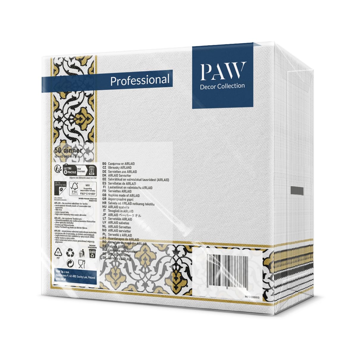 Einzelheiten: PAW Professional ist eine Marke, die sich sowohl an die Hotel- und Gastronomiebranche als auch für den täglichen Gebrauch bei Heimfeiern richtet. Airlaid-Produkte zeichnen sich durch hochwertiges, langlebiges Material, einfache Installation und gute Flüssigkeitsaufnahme aus, was sie ideal für den Einsatz sowohl in der HoReCa-Branche als auch zu Hause macht. Sie sind eine tolle Dekoration für jeden Tisch und verleihen ihm ein elegantes Aussehen.