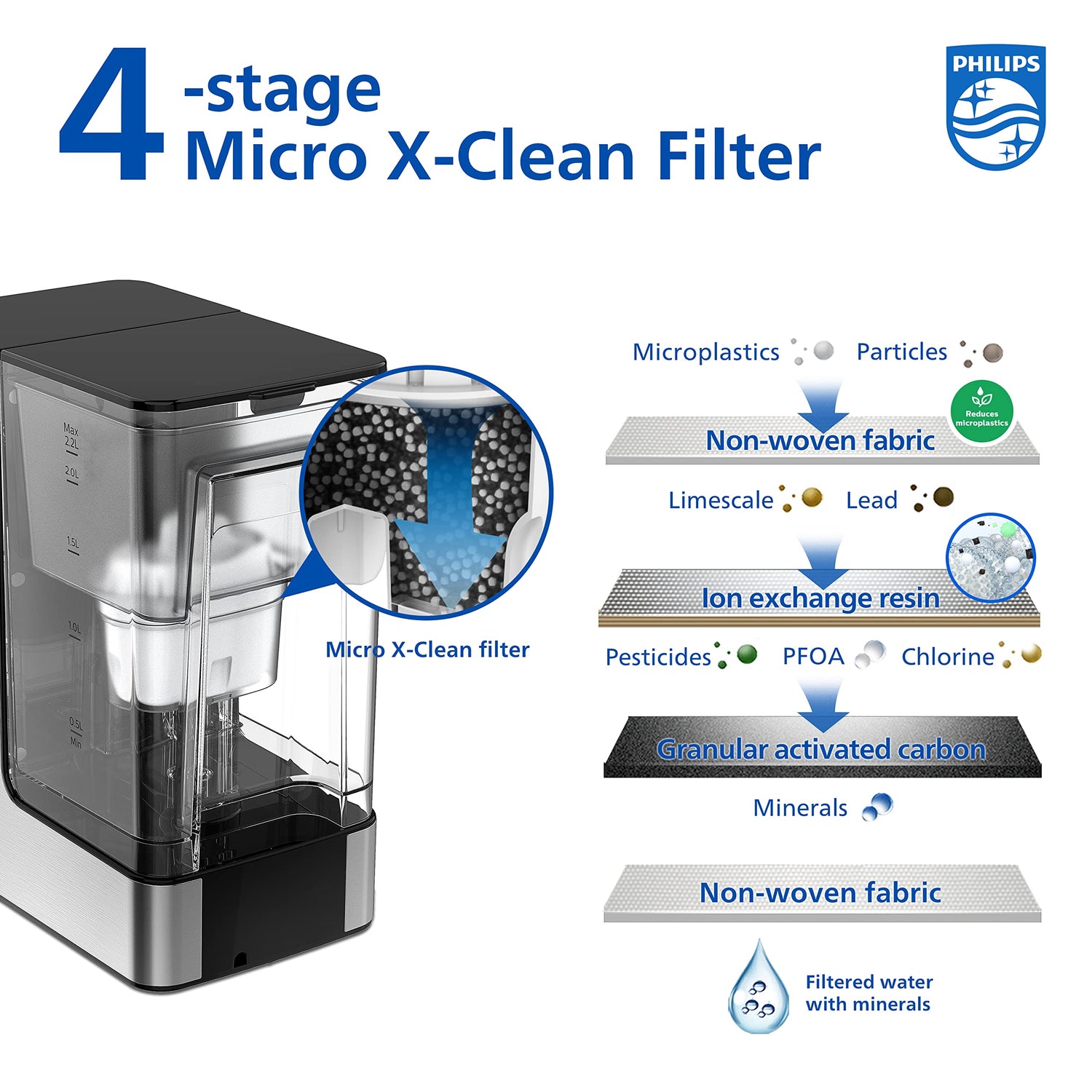 • MICRO X-CLEAN FILTER. Genießen Sie kristallklares und rein schmeckendes Wasser sowie geschmackvolle Heißgetränke. Der Philips Micro X-Clean-Filter reduziert Chlor, Kalk, Schwermetalle und neu auftretende Schadstoffe wie Mikroplastik und PFOA (die von diesem Wasserfilter reduzierten Schadstoffe oder anderen Substanzen sind nicht unbedingt im Wasser aller Benutzer enthalten).