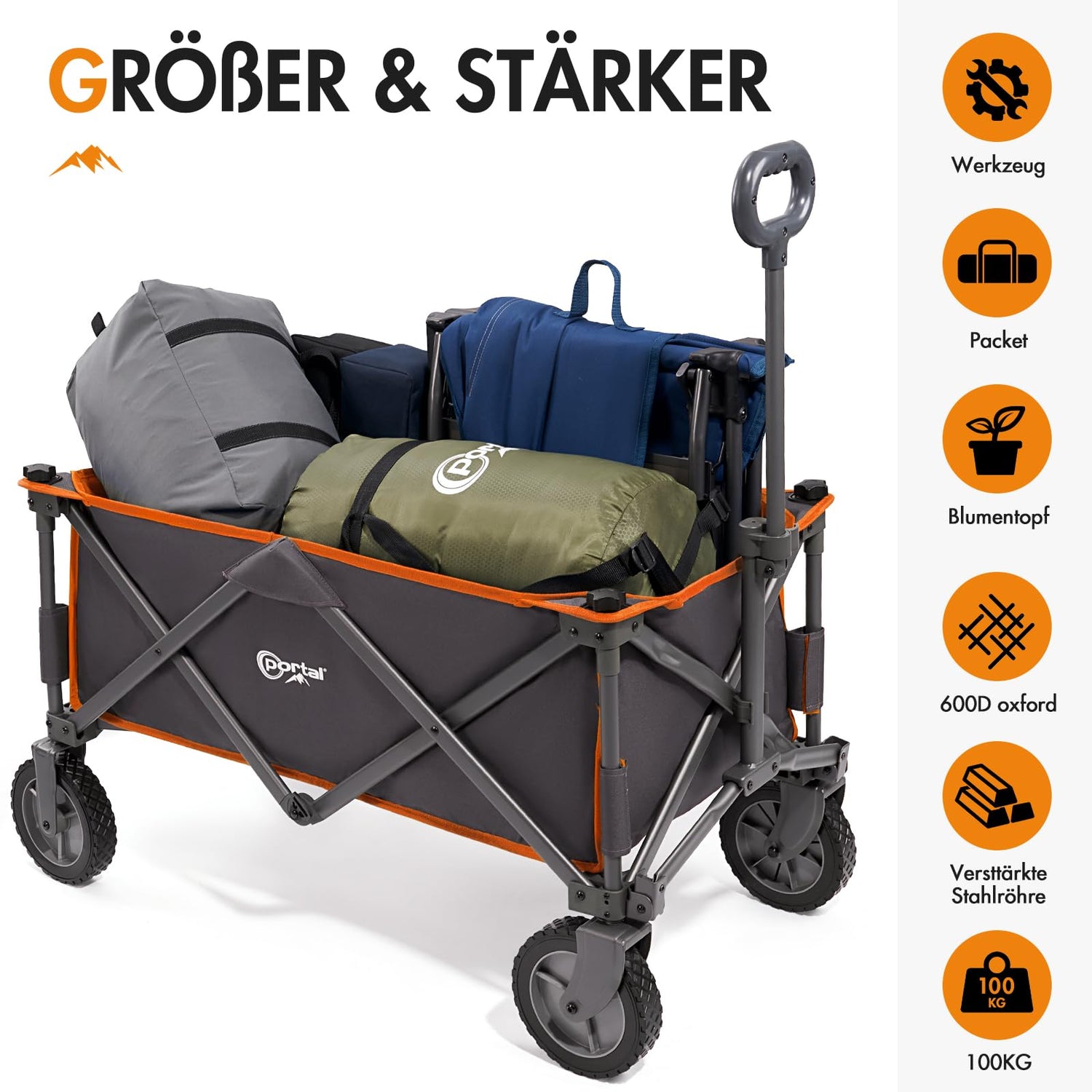 PORTAL Bollerwagen faltbar XXL Handwagen mit schnellspanerem Stoff Klappwagen Transportwagen tragbar Strandwagen Gartenwagen Faltwagen belastbar bis 100kg für Camping Garten Einkauf