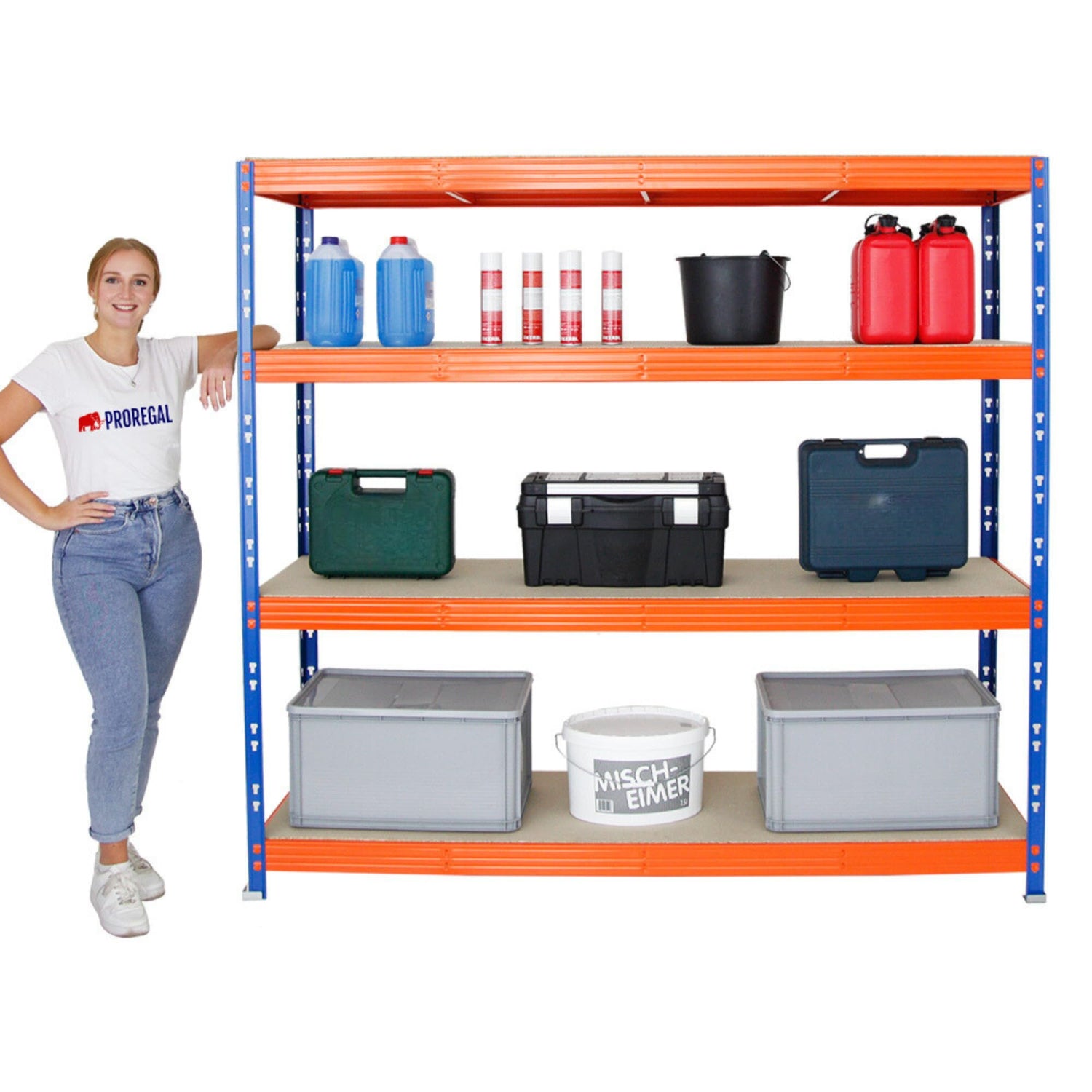 PROREGAL Profi Schwerlastregal Rhino EXTRA BREIT blau/orange HxBxT 180x200x60cm Fachlast 500kg 4X Spanplatten-Ebenen 8mm Garagenregal, Lagerregal, Steckregal, Weitspannregal