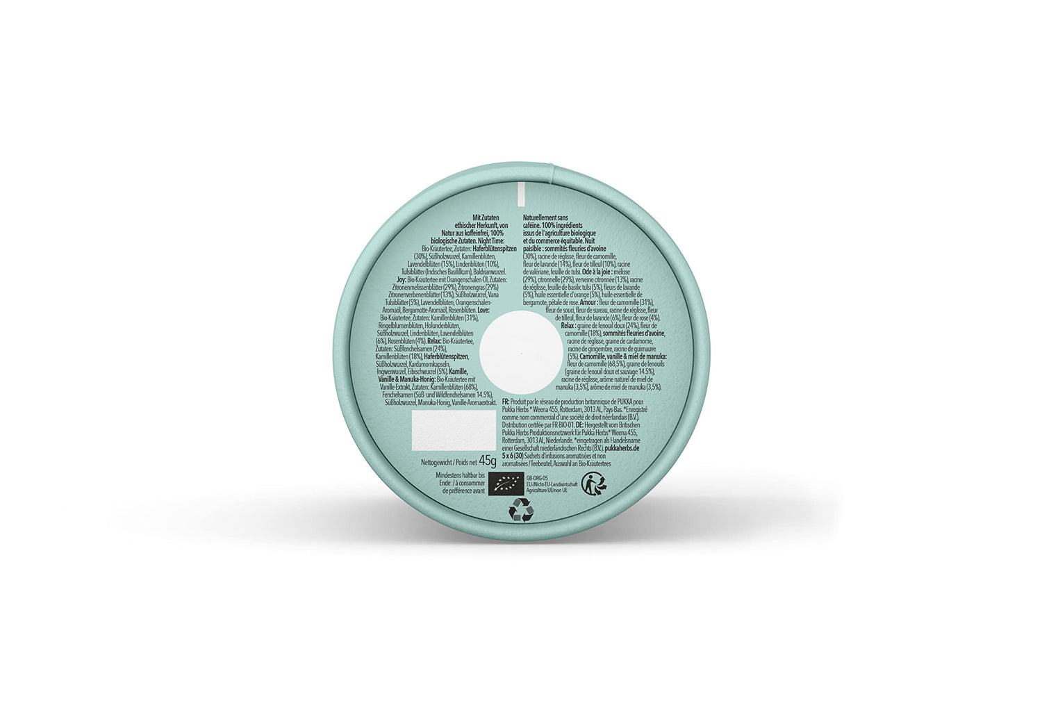 - Jede unserer Teemischungen enthält ethisch und nachhaltig beschaffte Zutaten aus biologischem Anbau. Jede Zutat wird von unserem Expertenteam auf den Gehalt an ätherischen Ölen geprüft, um sicherzustellen, dass unsere Mischungen von höchster Qualität sind. Die kostbaren Bio-Kräuter werden in unseren FSC-zertifizierten, recycelbaren Teebeuteln geschützt. Diese bewahren die Qualität und den Geschmack solange, bis du den wunderbaren Bio-Tee genießen kannst.