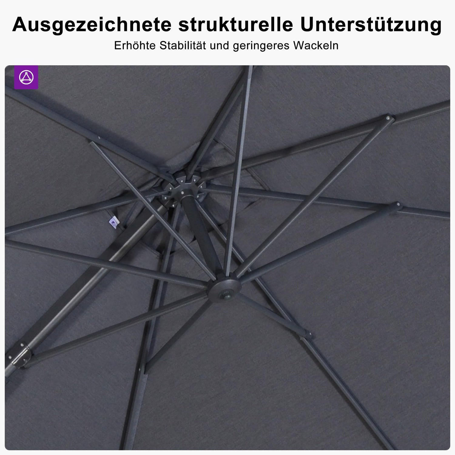 • Erhöhte Windbeständigkeit: Die Oberseite des Schirms ist mit 8 stabilen Aluminiumrippen versehen, die für ausreichend Halt sorgen. In Verbindung mit dem dreieckigen Armdesign verbessert dies die Wind- und Wetterbeständigkeit des Schirms erheblich