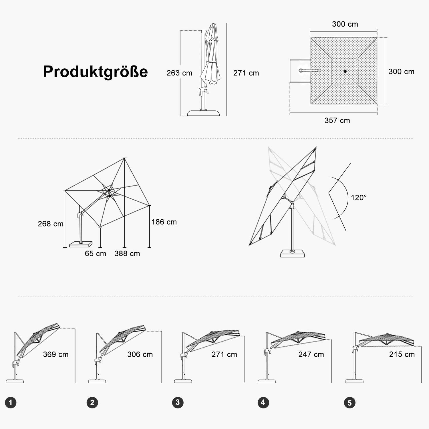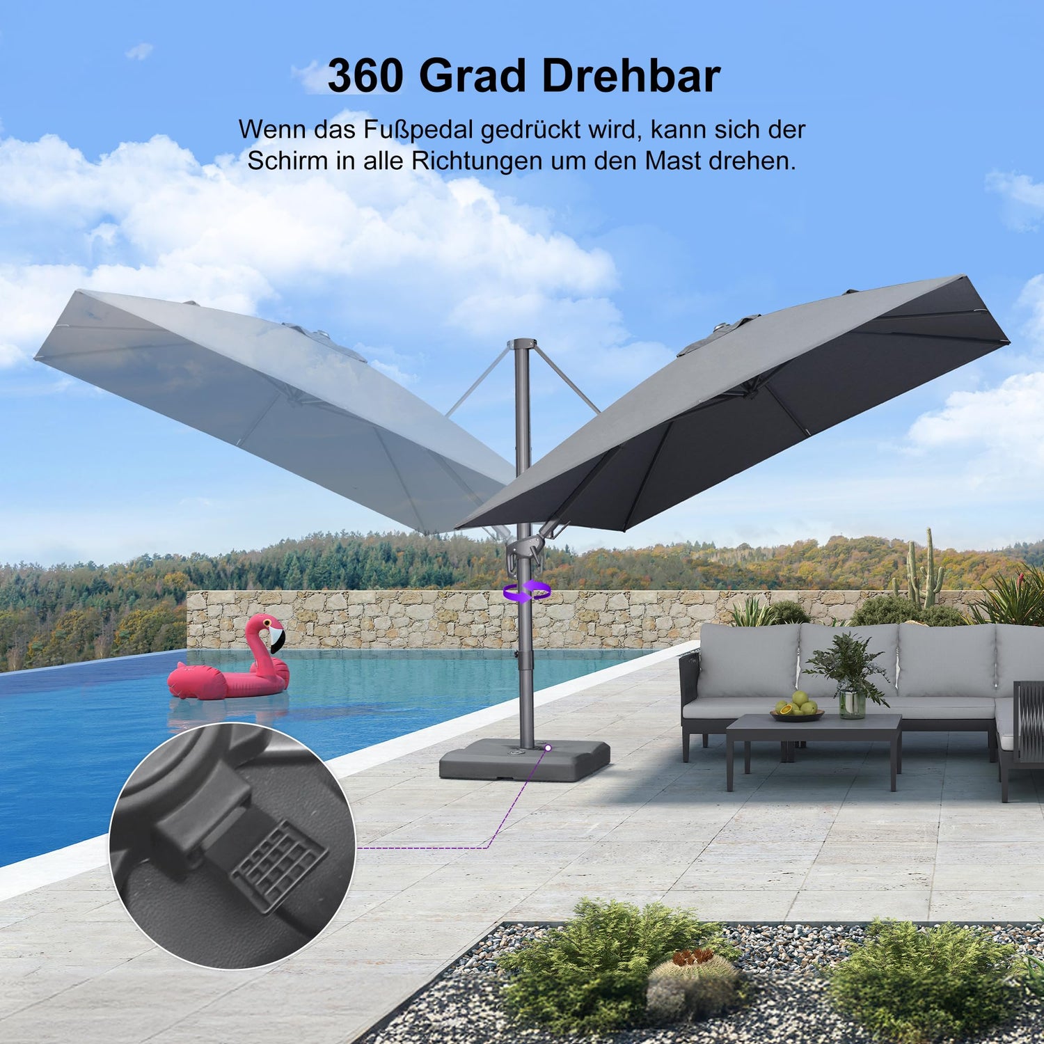 • Beidseitige Axialdrehung: Der Schirm ist um 360° drehbar und kann außerdem in 6 Winkeln geneigt und in beide Richtungen geschwenkt werden, um die Sonne abzuschirmen