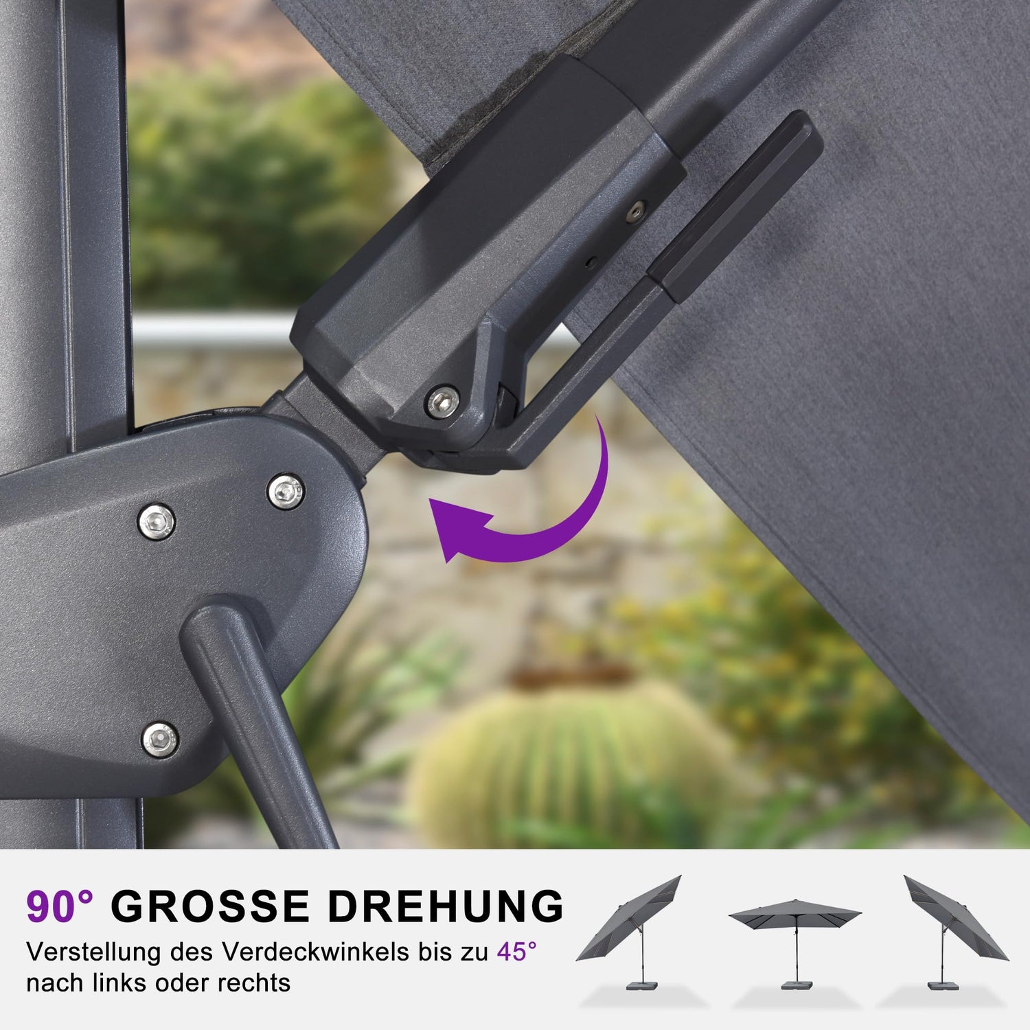 PURPLE LEAF Ampelschirm Twist 300 x 300 cm Sonnenschirm mit Strapazierfähiges Gewebe, Gartenschirm mit Kurbel, Gestell Alu, 360° Rotation, Beidseitig Axial Schwenken, UV50+, Anthrazit