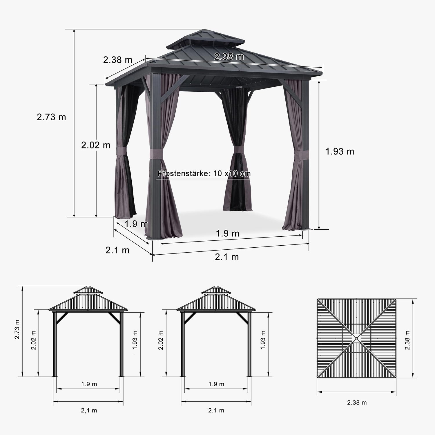 • Alu Rahmen: Der Rahmen besteht aus pulverbeschichtetem Aluminium, um Rost und Verblassen zu widerstehen. Die Säulengröße beträgt 10 x 10 cm. Jeder Sockel verfügt über vorgebohrte Löcher und kann mit Dehnschrauben am Betonfundament befestigt werden, um die Stabilität des Pavillons zu erhöhen
