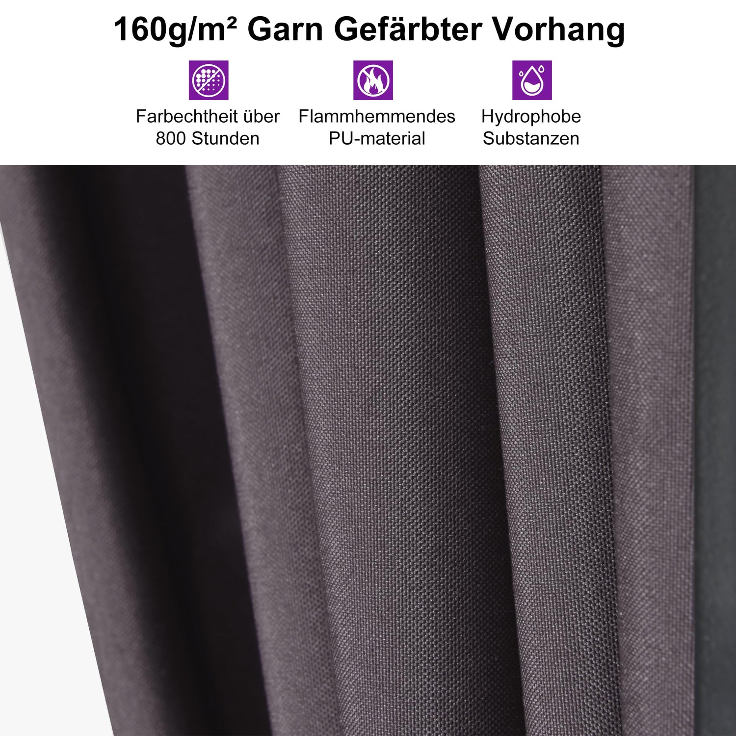 • Doppelte Seitenwand: Die Vorhänge und Moskitonetze mit doppelseitigen Reißverschlüssen sind abnehmbar und waschbar und verfügen über ein Doppelschienendesign, das gleichzeitig oder separat verwendet werden kann. Die Vorhänge bestehen aus garngefärbtem Stoff mit einem Gewicht von 160 g/m² und einer Farbechtheit von über 800 Stunden, und das Netz ist aus Textilene gefertigt, Gewicht erreicht 110 g/㎡. Beide bestehen aus flammhemmenden PU-Materialien