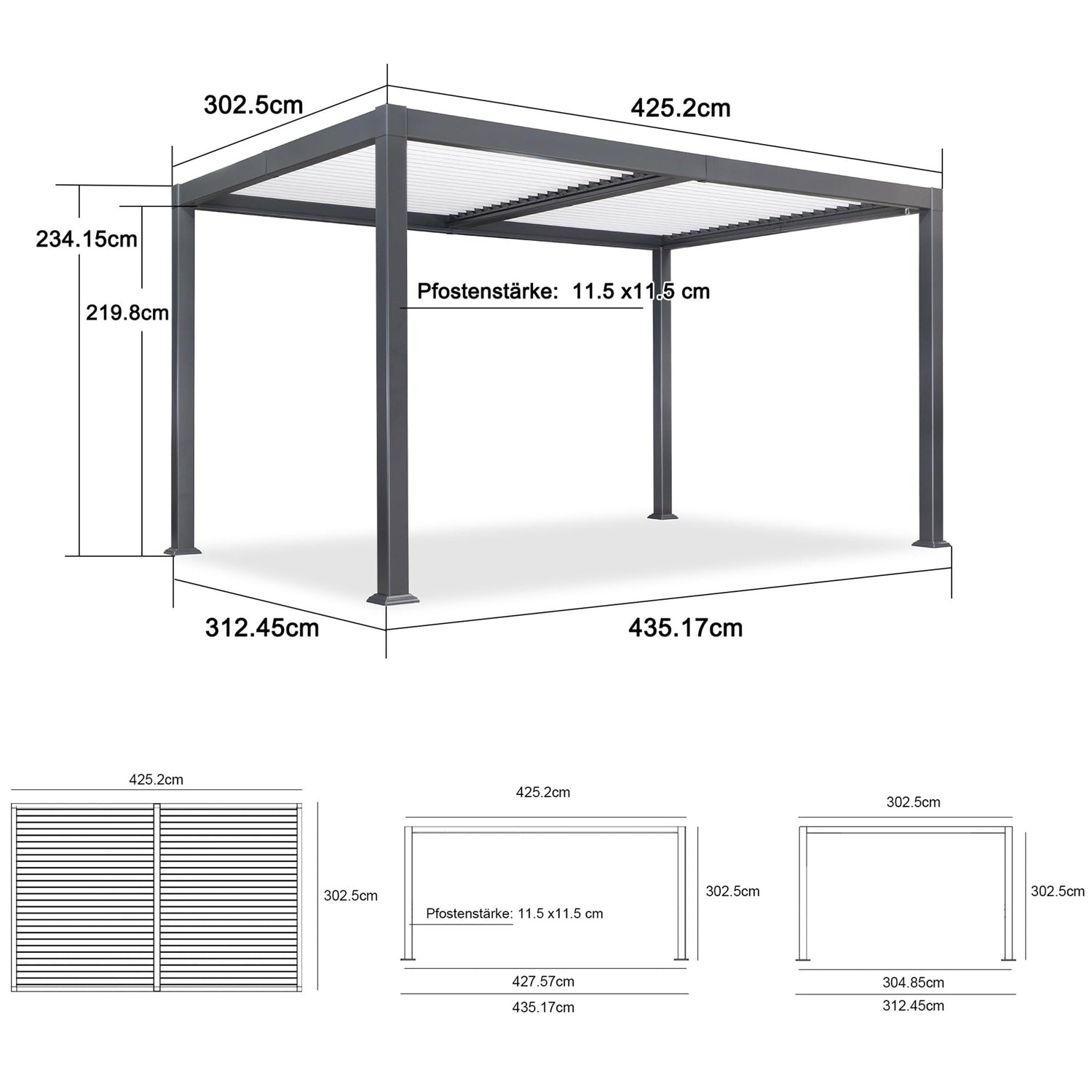 • Tipp: Die 4 Säulen müssen mit Dehnschrauben am Betonfundament befestigt werden. Bei starkem Wind, starkem Schneefall, Hagel oder anderen extremen Wetterbedingungen öffnen Sie die Lamellendächer, um mögliche Schäden an der Pergola zu vermeiden