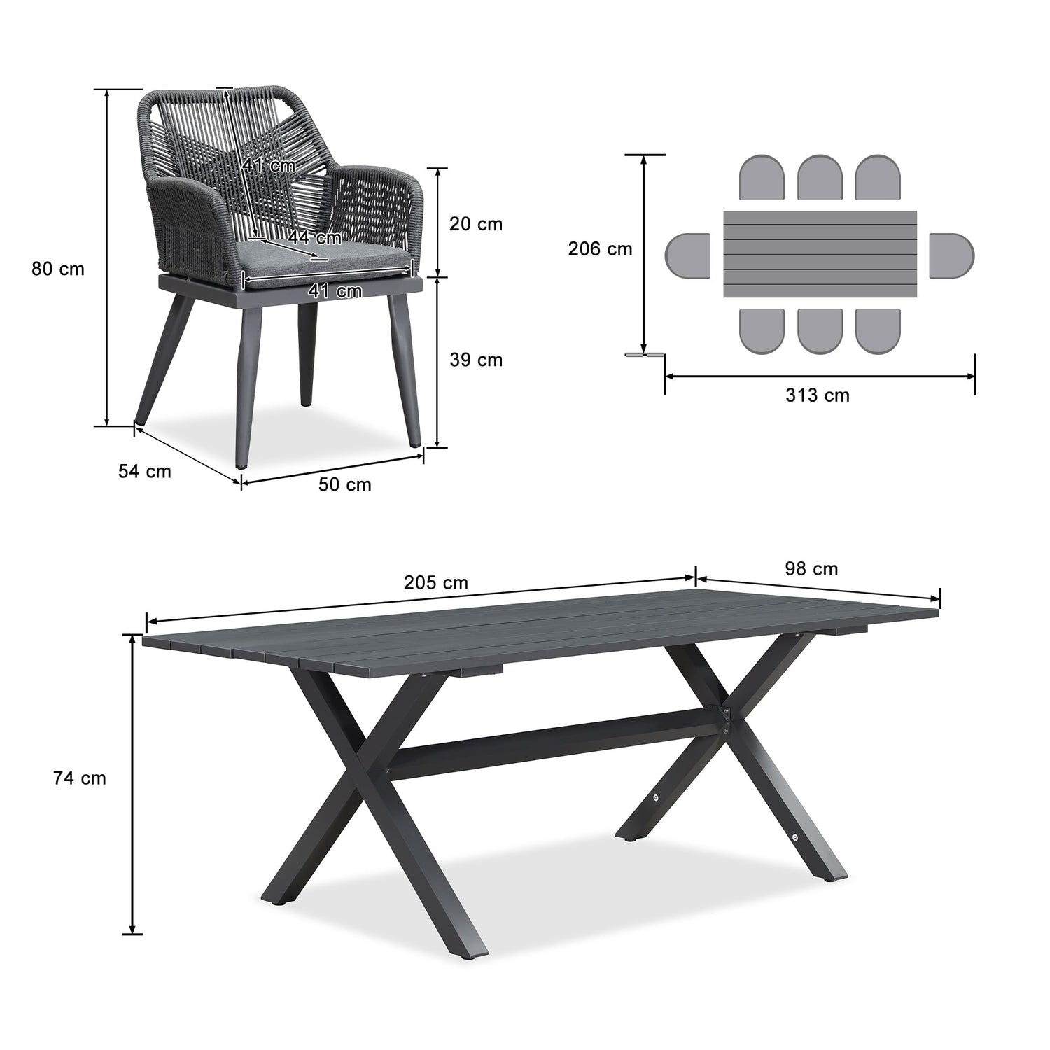 • Allwetter-9-TLG Ess-Set: Enthält 1 Rechteckigen Grauen Tisch (205L x 98B x 74H) und 8 Graue Stühle (50B x 54T x 80H, 39SH)