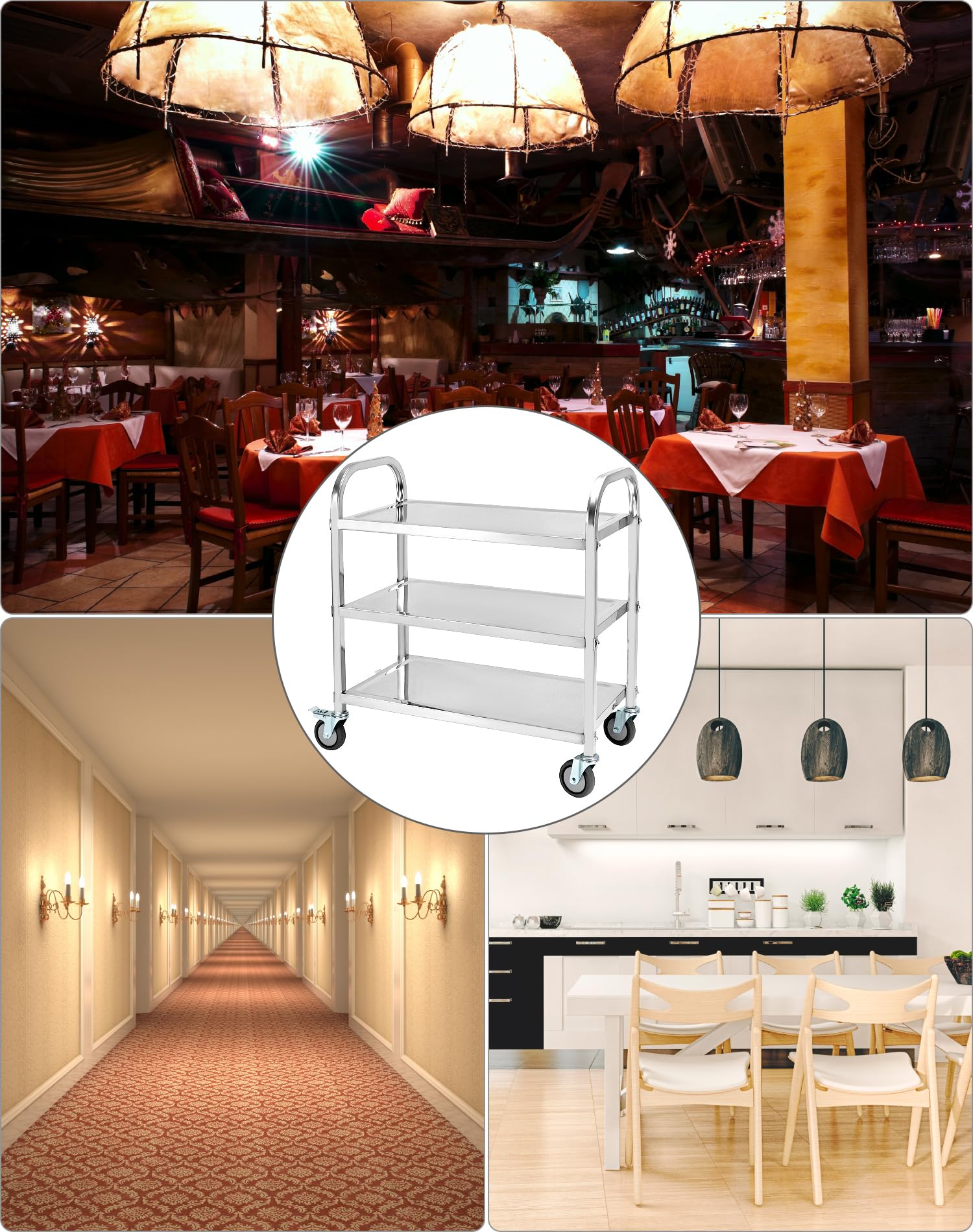 QWORK® 3-Etagen Edelstahl Servierwagen Teewagen Reinigungswagen mit Vibrationsarmen Bremse Lenkrollen für Küche, Hotel, Restaurant (75 x 40 x 83,5 cm)