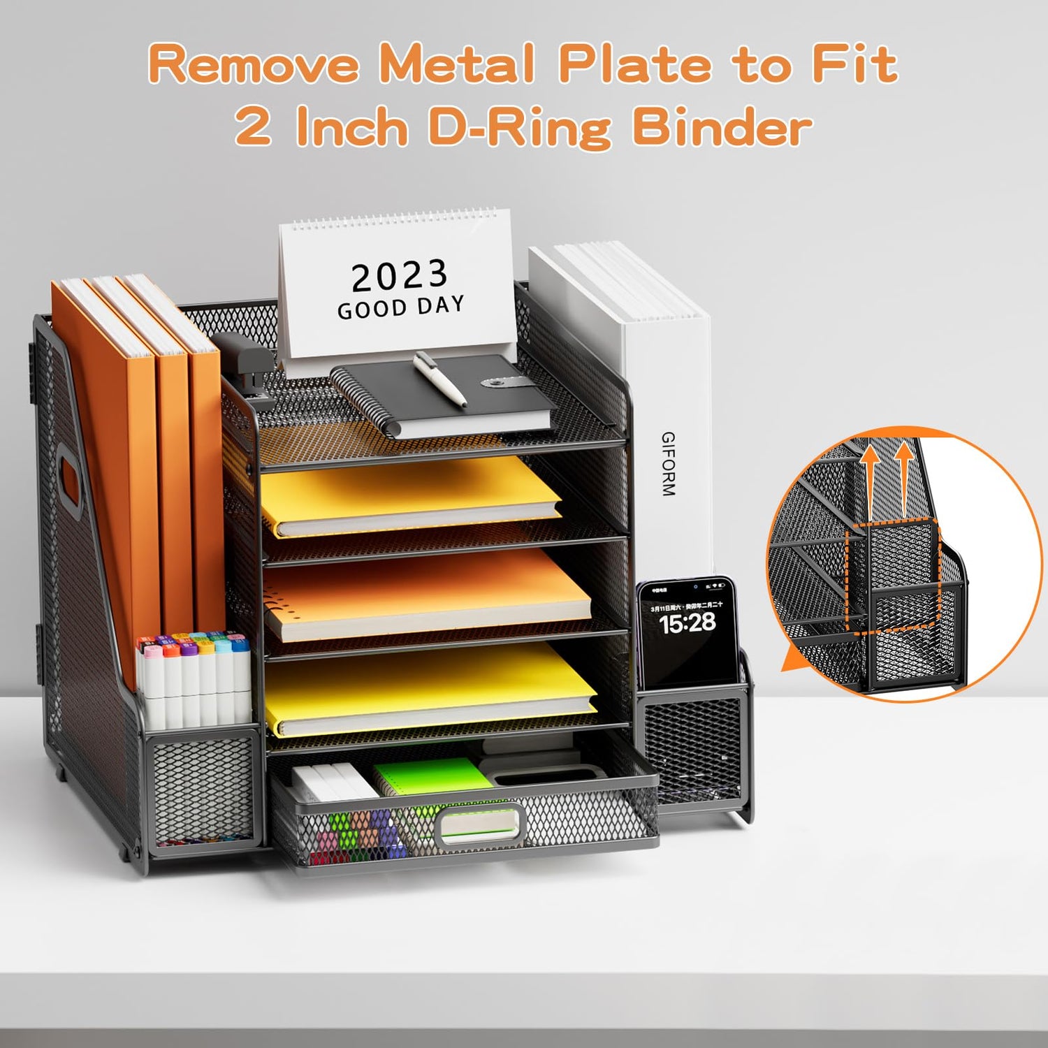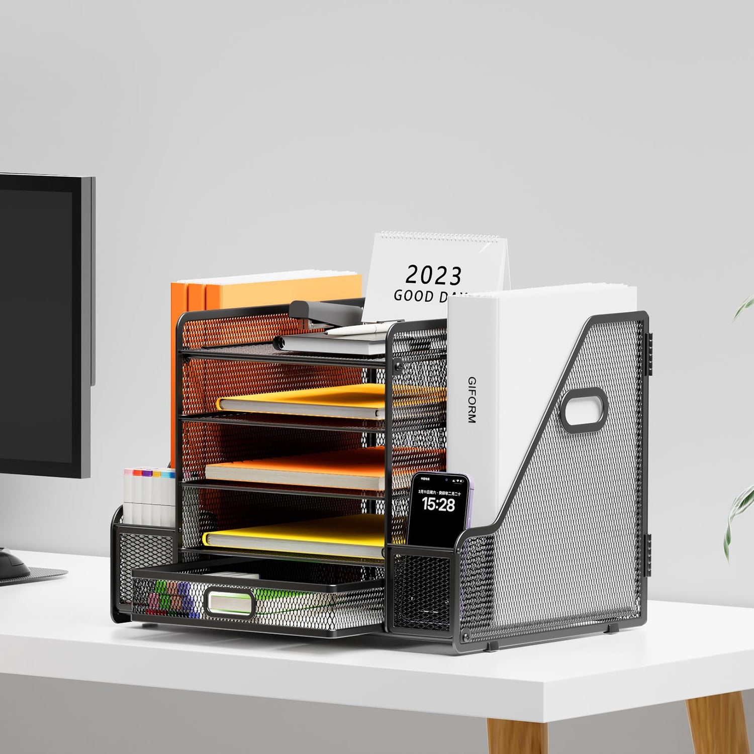 Restorgan Schreibtisch Organizer mit Aktenhalter, 5-stufiger Papier Organizer mit Schublade, Mesh Schreibtisch Akten Organizer mit Zeitschriftenhalter für Büro Organizer Schreibtisch (schwarz)