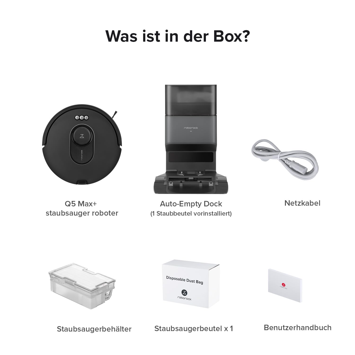 • Lieferumfang: Im Lieferumfang enthalten sind: 1x Q5 Max+ Saugroboter, 1x automatische Staubentleerungsstation, 1x Netzkabel, 1x Staubbehälter, 2x Staubbeutel, 1x Seitenbürste und 1x Benutzerhandbuch.