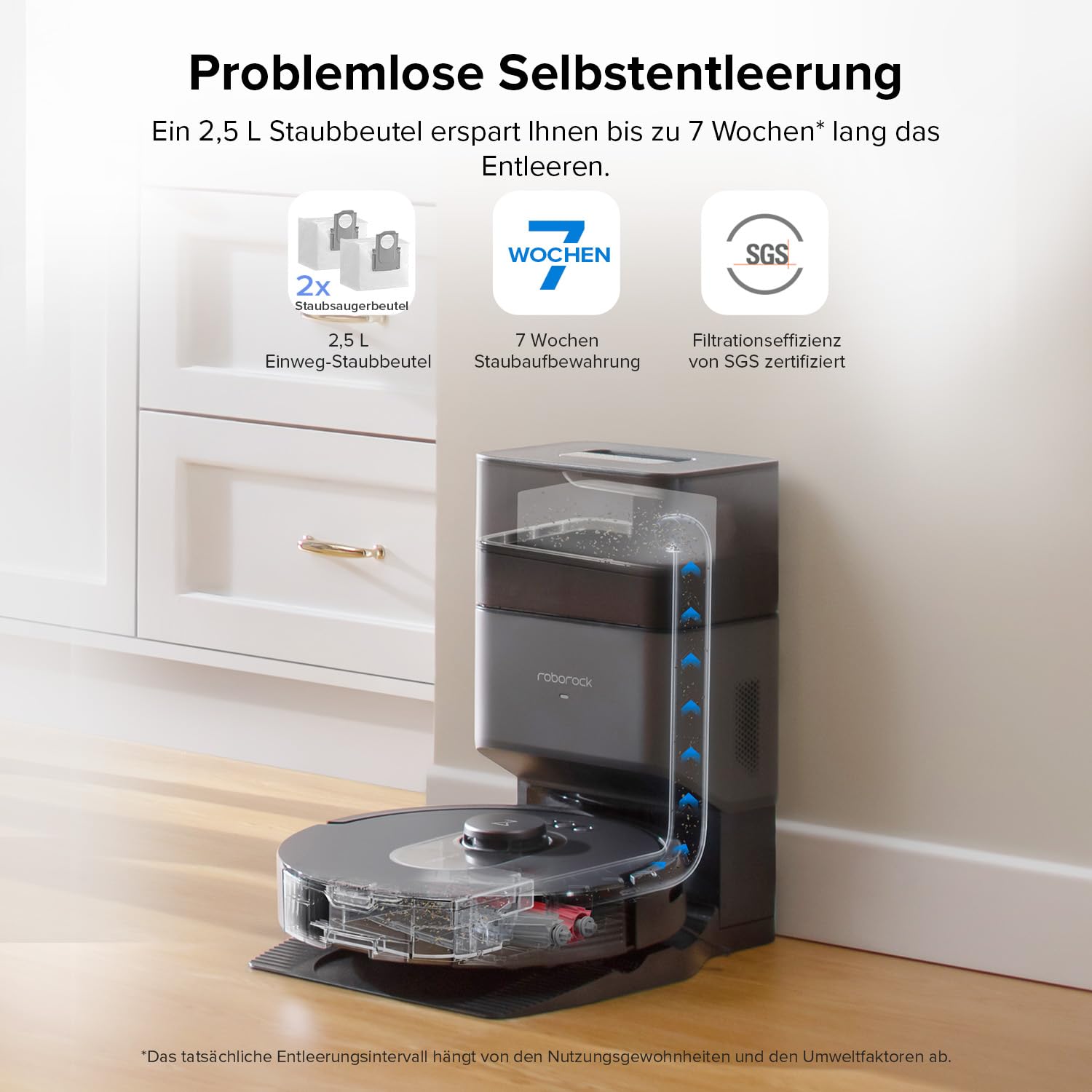 • Bis zu 7 Wochen freihändige Reinigung: Erleben Sie den Komfort der automatischen Staubentleerung mit zwei 2,5 L Staubbeuteln, die es ermöglichen, bis zu 7 Wochen ohne manuelle Entleerung auszukommen. Hergestellt aus hochwirksamem Material, tragen die Staubbeutel zur Reduzierung von Staub bei und fördern ein saubereres Wohnumfeld.