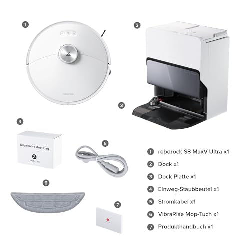 roborock S8 MaxV Ultra Saugroboter mit Wischfunktion&Hebarem Wischmopp, Umfangreiche Reinigung Durch die ausfahrbaren Seitenbürste, 10.000 Pa, 60 °C Heißwasser-Moppwäsche, All-in-One-Dock