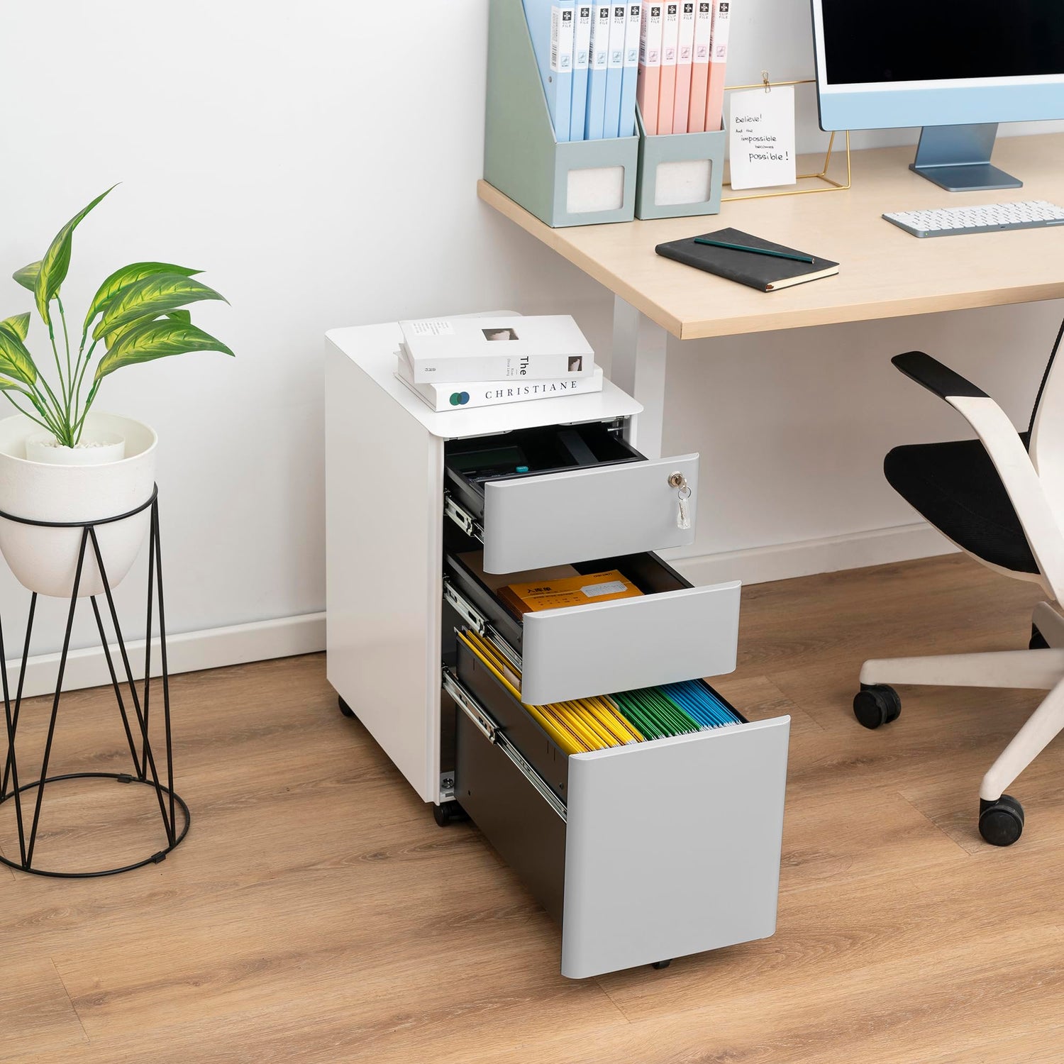 Rollcontainer mit Schubladen, Aktenschrank Abschließbar Metall, Mobiler Metallschrank für Home Office, für Rechts-/Rechtliches/Briefgröße, Komplett Montiert, Aktenschrank Weiß + Grau
